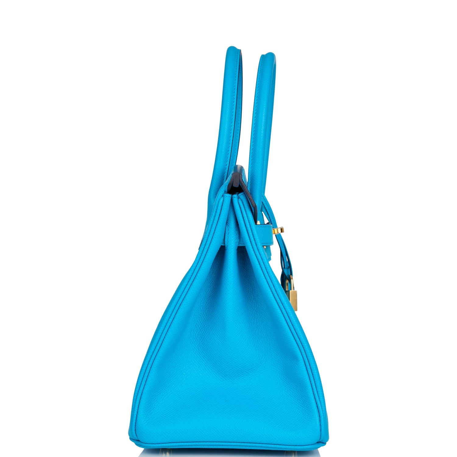 This Birkin is in Bleu Frida epsom leather with gold hardware and has tonal stitching, front flap, two straps with center toggle closure, clochette with lock and two keys, and double rolled handles.