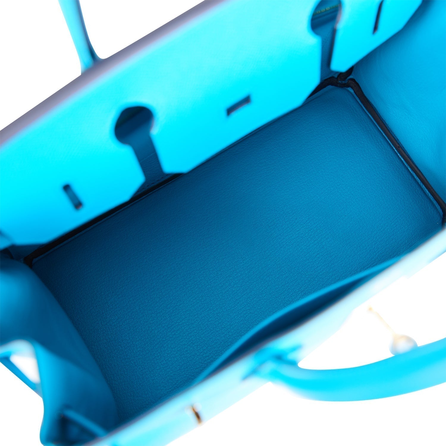 The interior is lined with Bleu Frida chevre and has one zip pocket with an Hermes engraved zipper pull and an open pocket on the opposite side.
