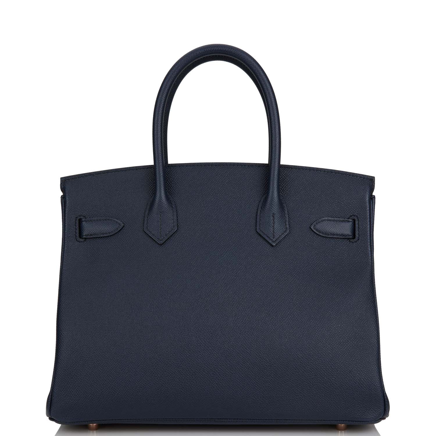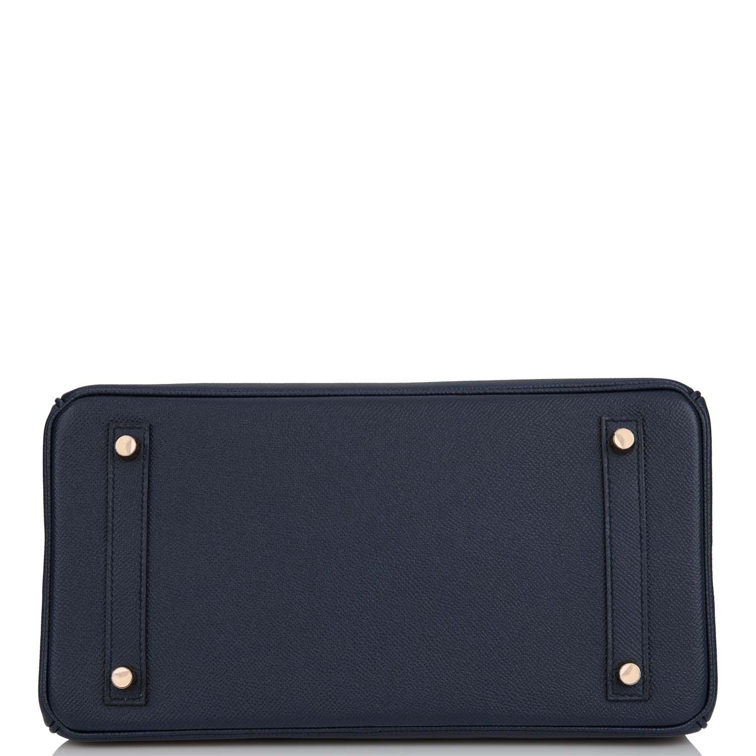 This Birkin is in Bleu Indigo epsom leather with rose gold hardware and has tonal stitching, front flap, two straps with center toggle closure, clochette with lock and two keys, and double rolled handles.