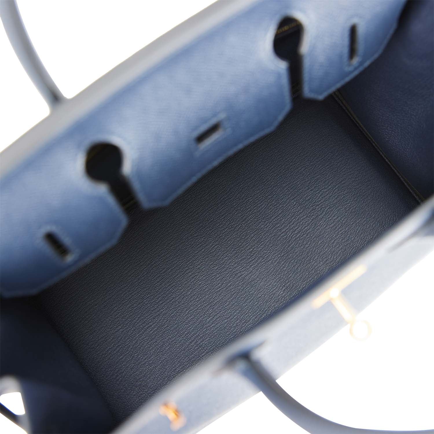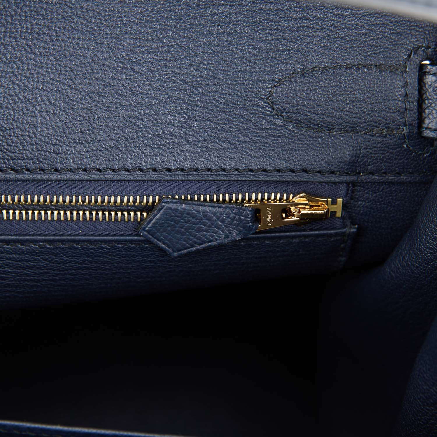 The interior is lined with Bleu Indigo chevre and has one zip pocket with an Hermes engraved zipper pull and an open pocket on the opposite side.