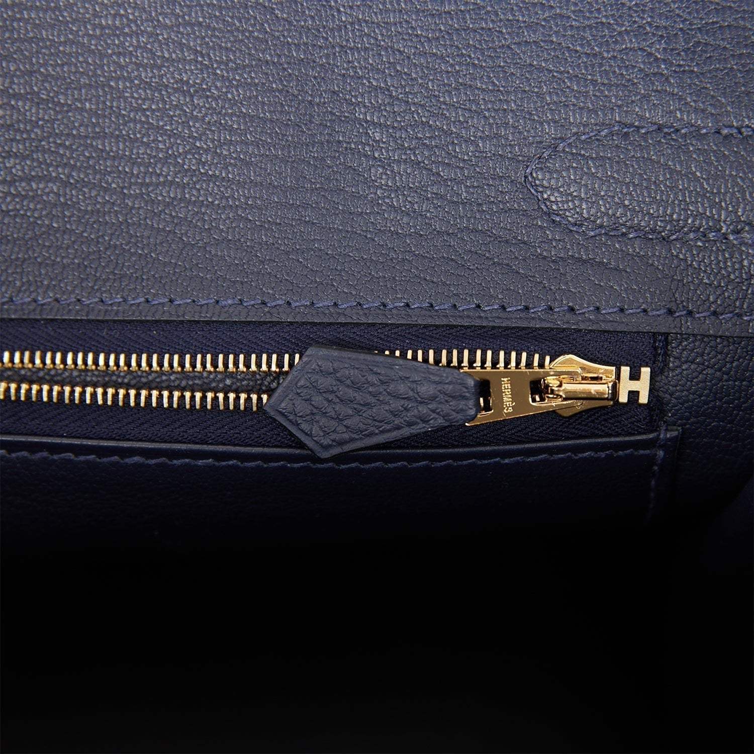 This Birkin is in Bleu Nuit togo leather with gold hardware and has tonal stitching, front flap, two straps with center toggle closure, clochette with lock and two keys, and double rolled handles.