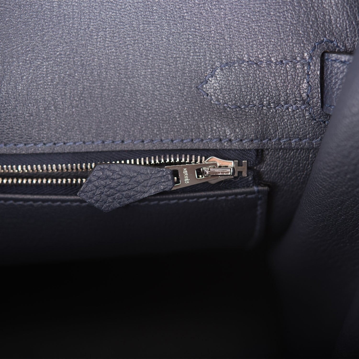This Birkin is in Bleu Nuit togo leather with palladium hardware and has tonal stitching, front flap, two straps with center toggle closure, clochette with lock and two keys, and double rolled handles.
