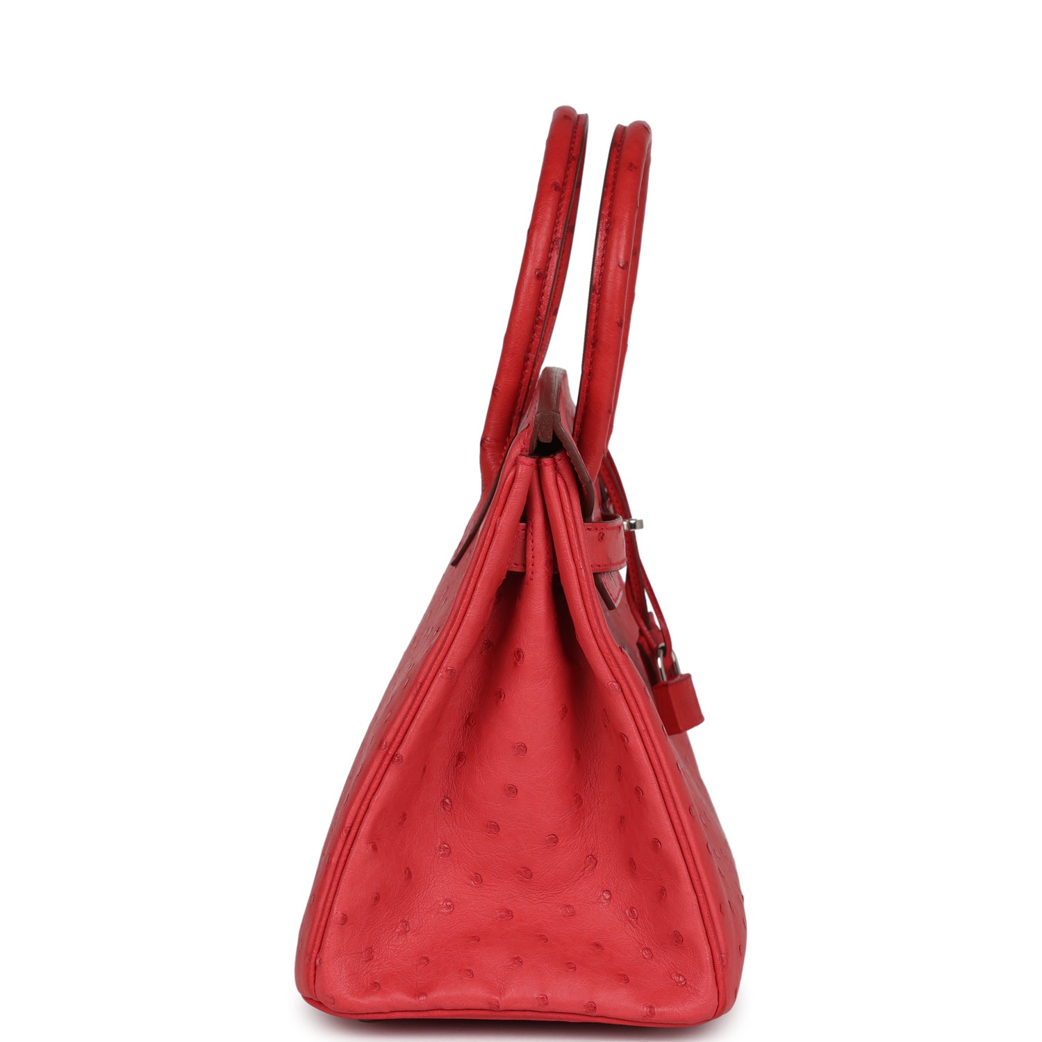 Birkin is in Bougainvillea ostrich leather with palladium hardware and features tonal stitching, front flap, two straps with center toggle closure, clochette with lock and two keys, and double rolled handles.