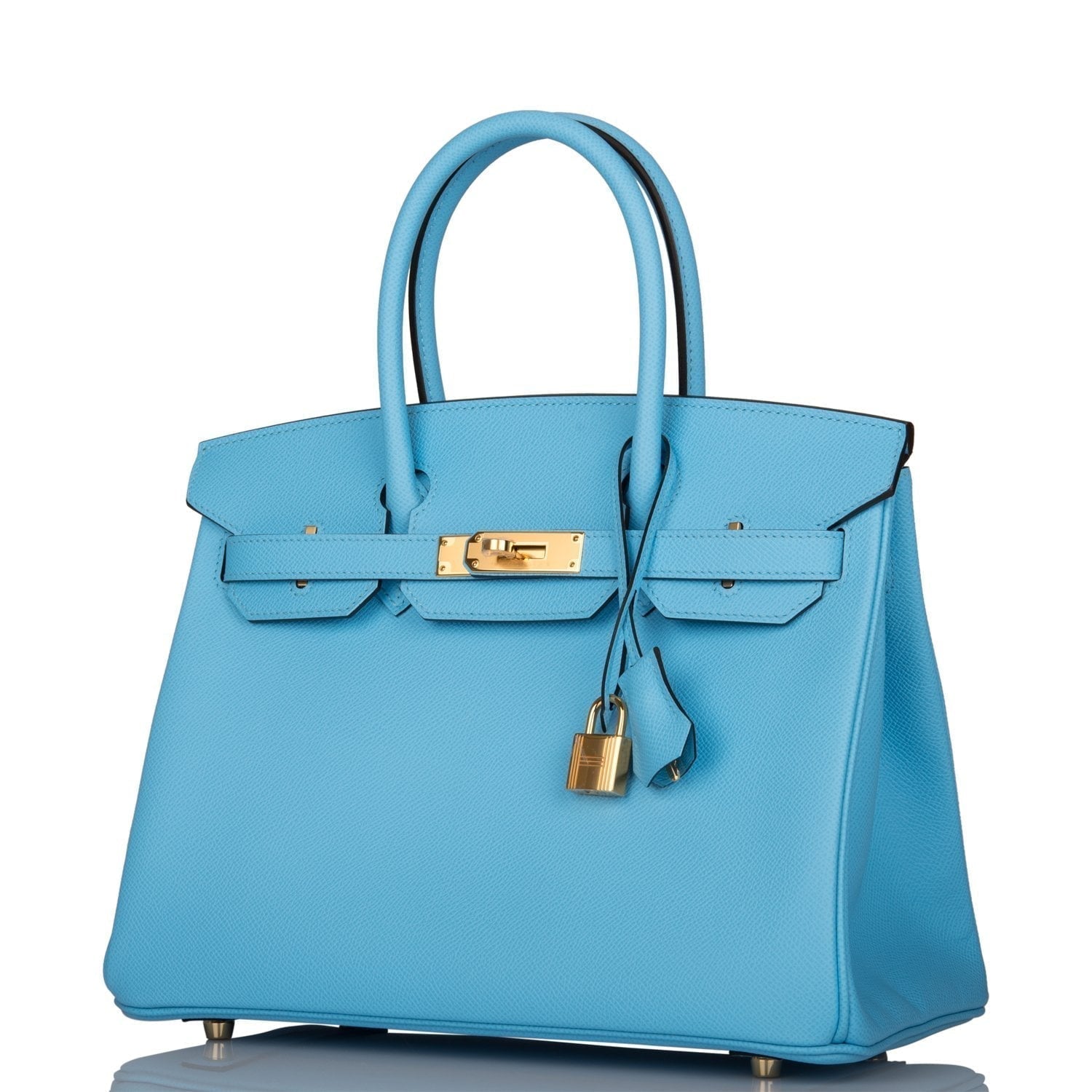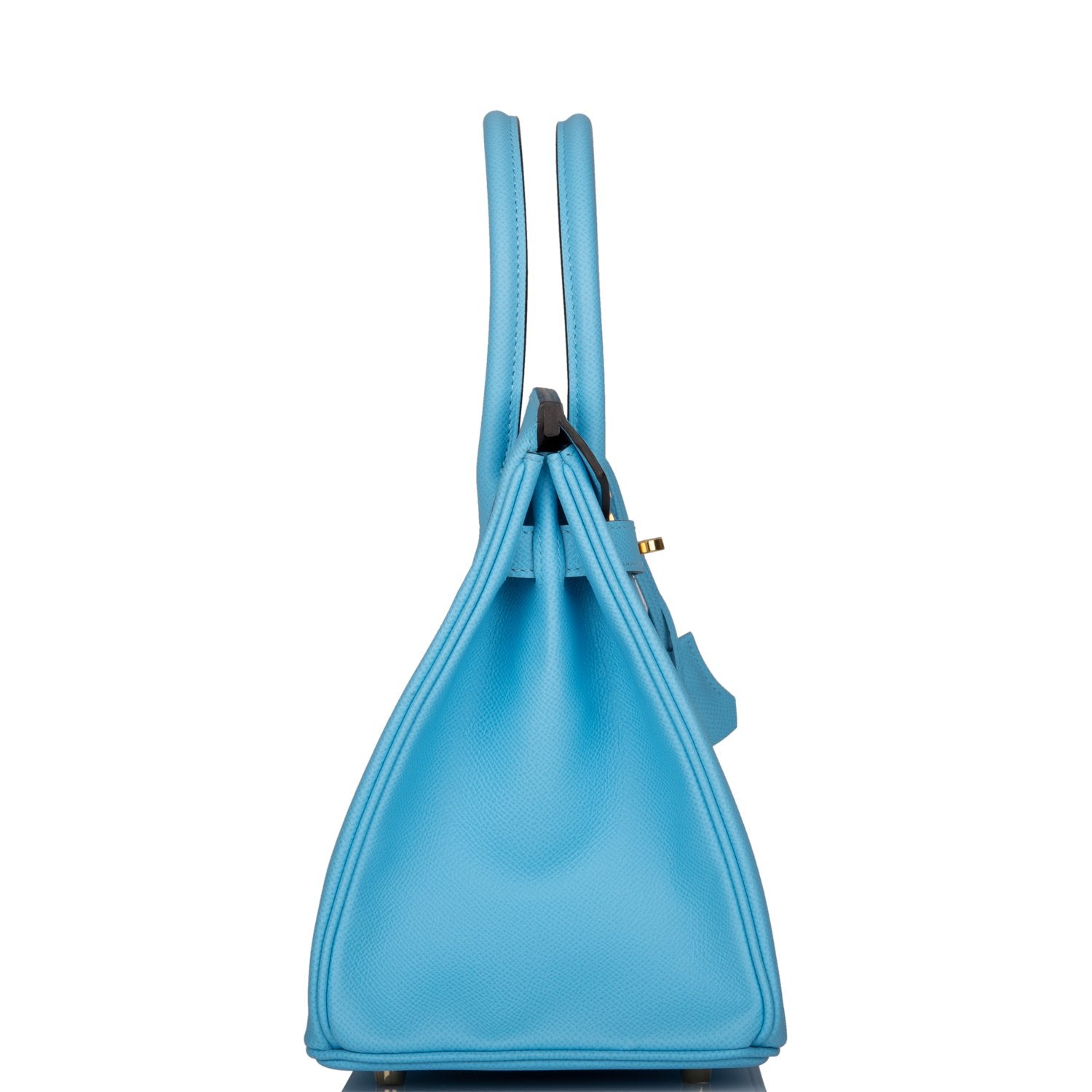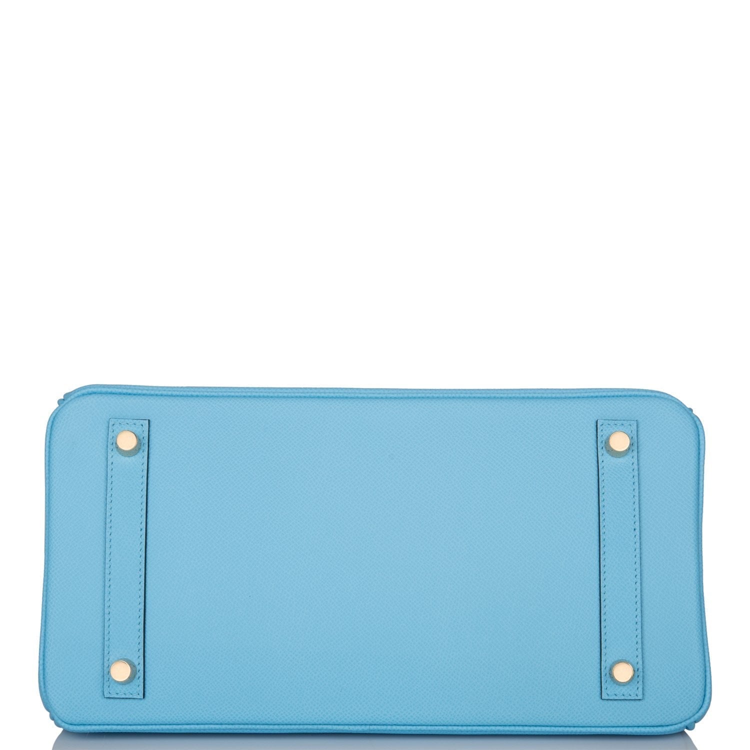 This Birkin is in Celeste epsom leather with gold hardware and has tonal stitching, front flap, two straps with center toggle closure, clochette with lock and two keys, and double rolled handles.