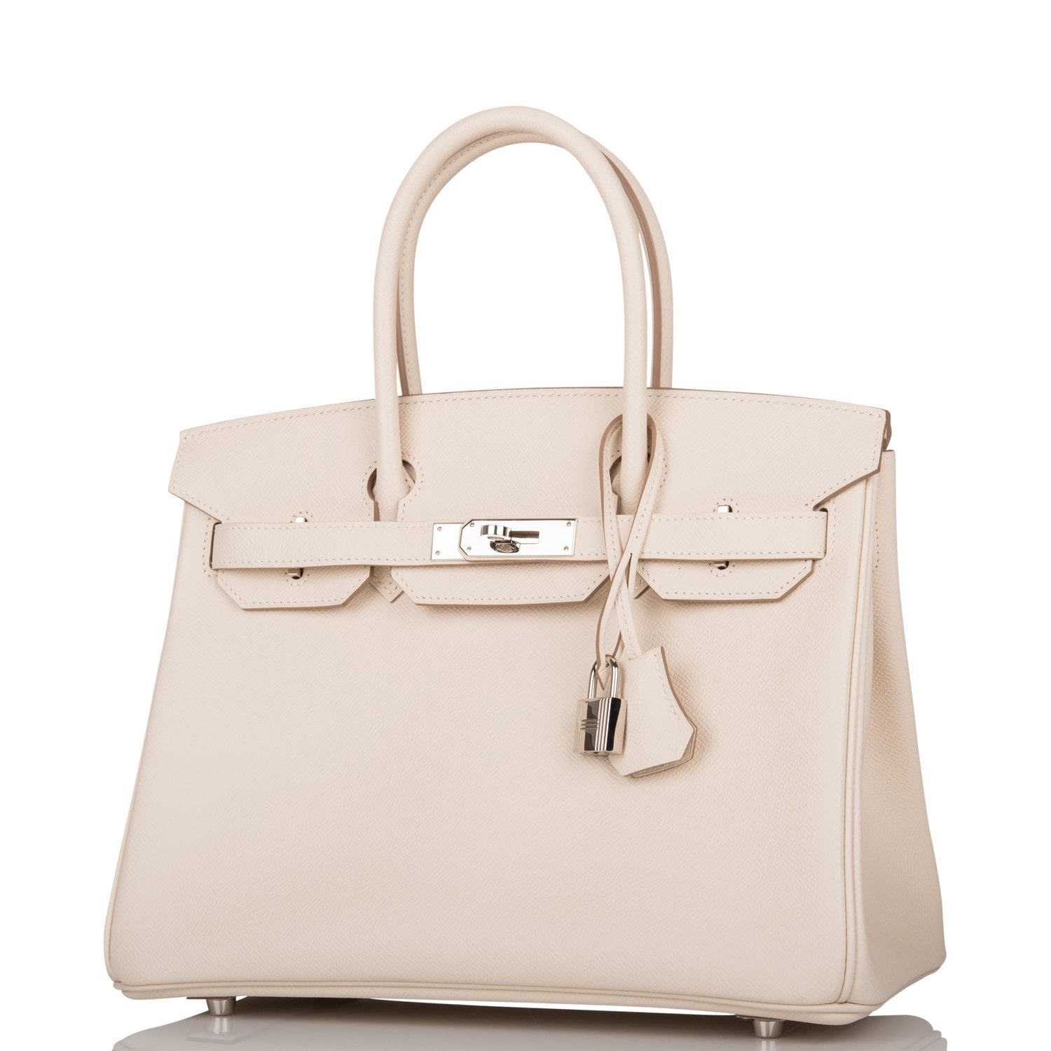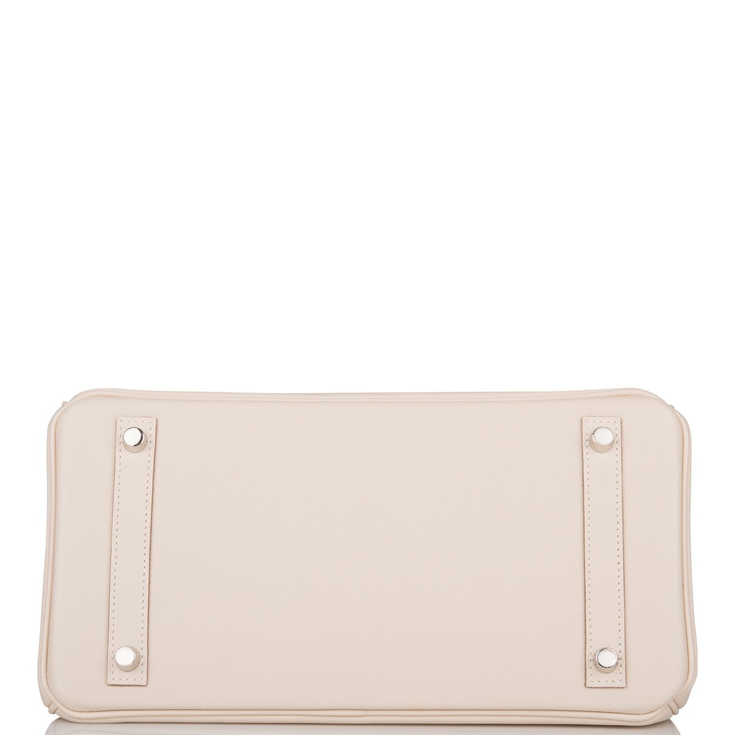 This Birkin is in Craie epsom leather with palladium hardware and has tonal stitching, front flap, two straps with center toggle closure, clochette with lock and two keys, and double rolled handles.