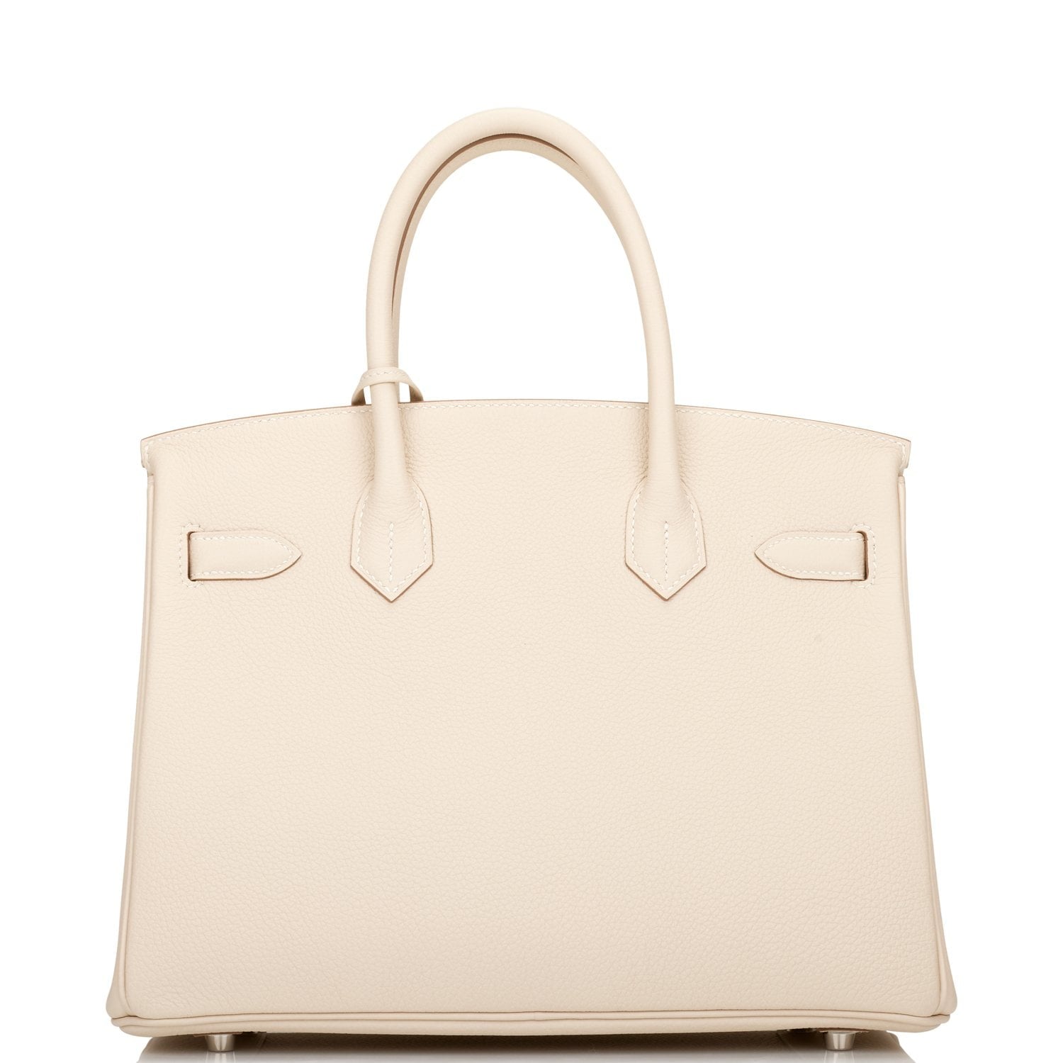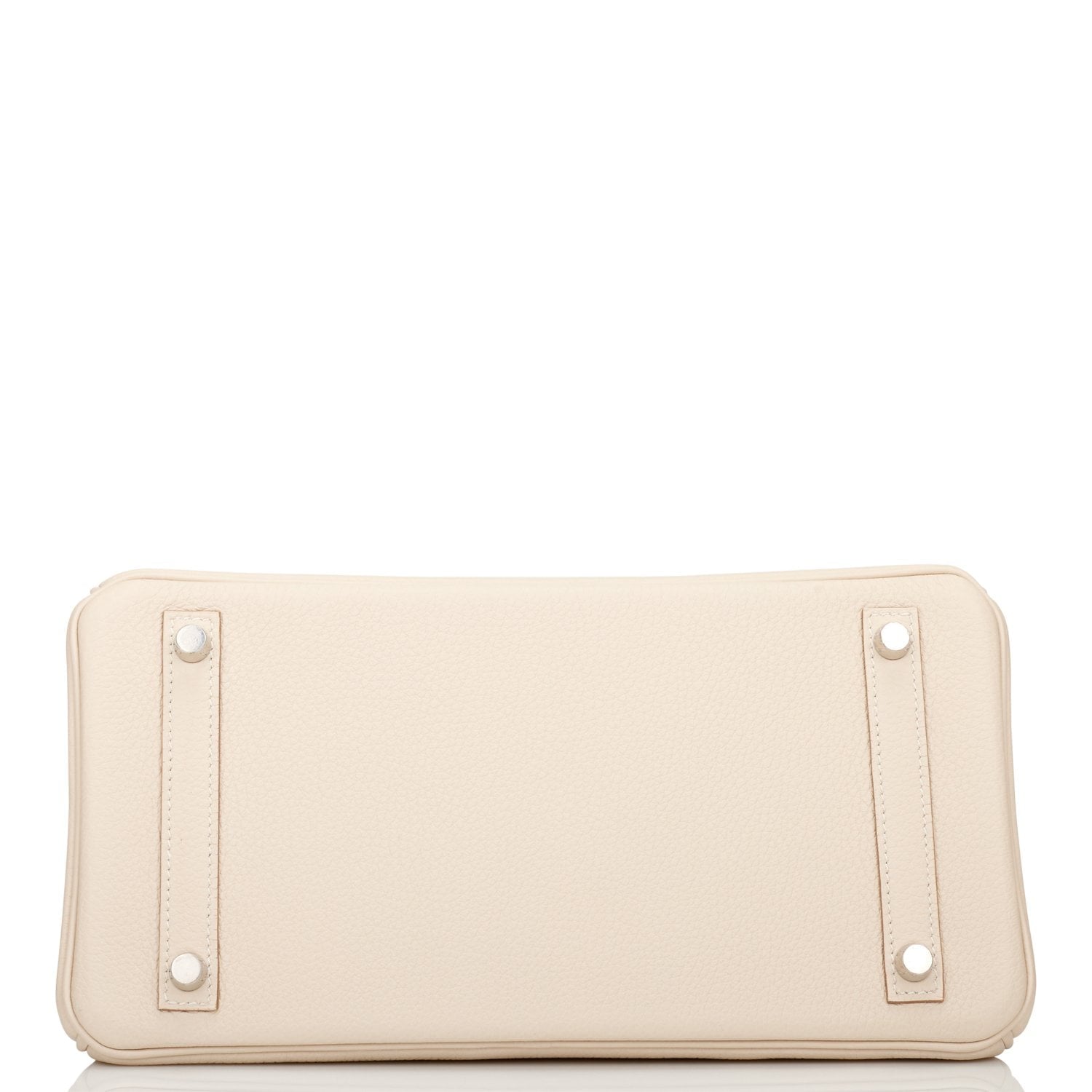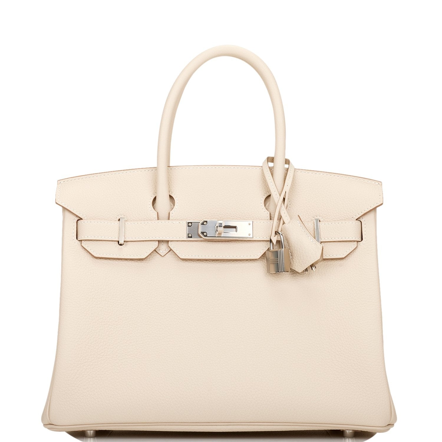 This Birkin is in Craie togo leather with palladium hardware and has tonal stitching, front flap, two straps with center toggle closure, clochette with lock and two keys, and double rolled handles.
