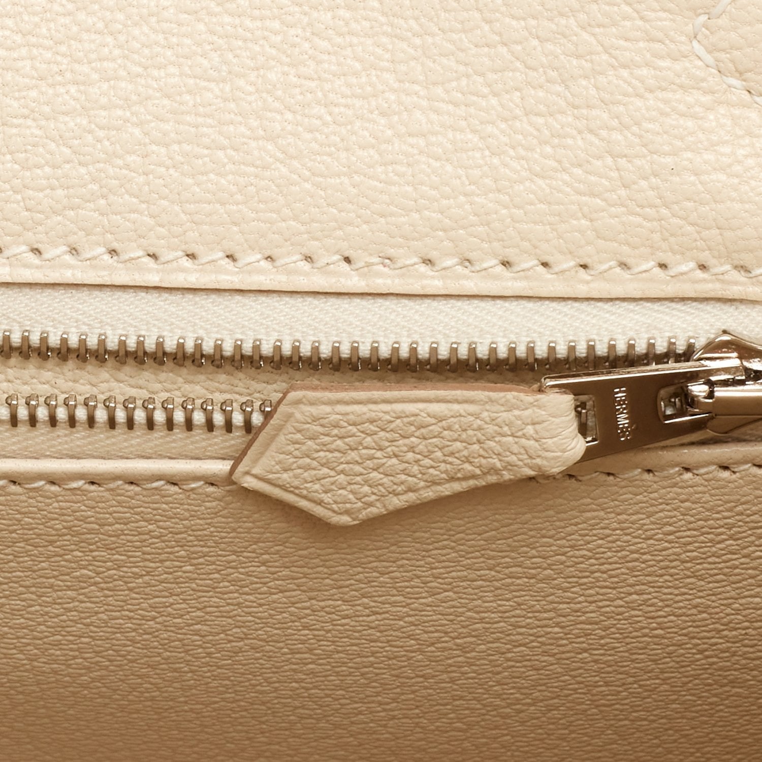 The interior is lined with Craie chevre and has one zip pocket with an Hermes engraved zipper pull and an open pocket on the opposite side.