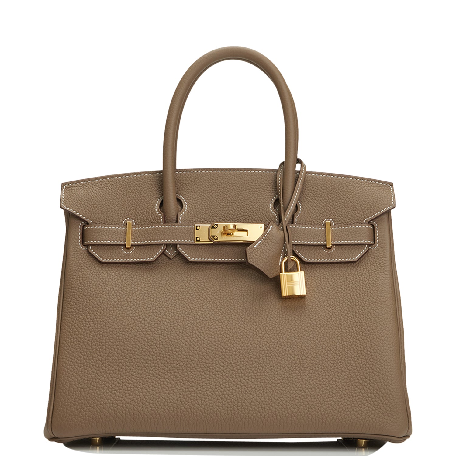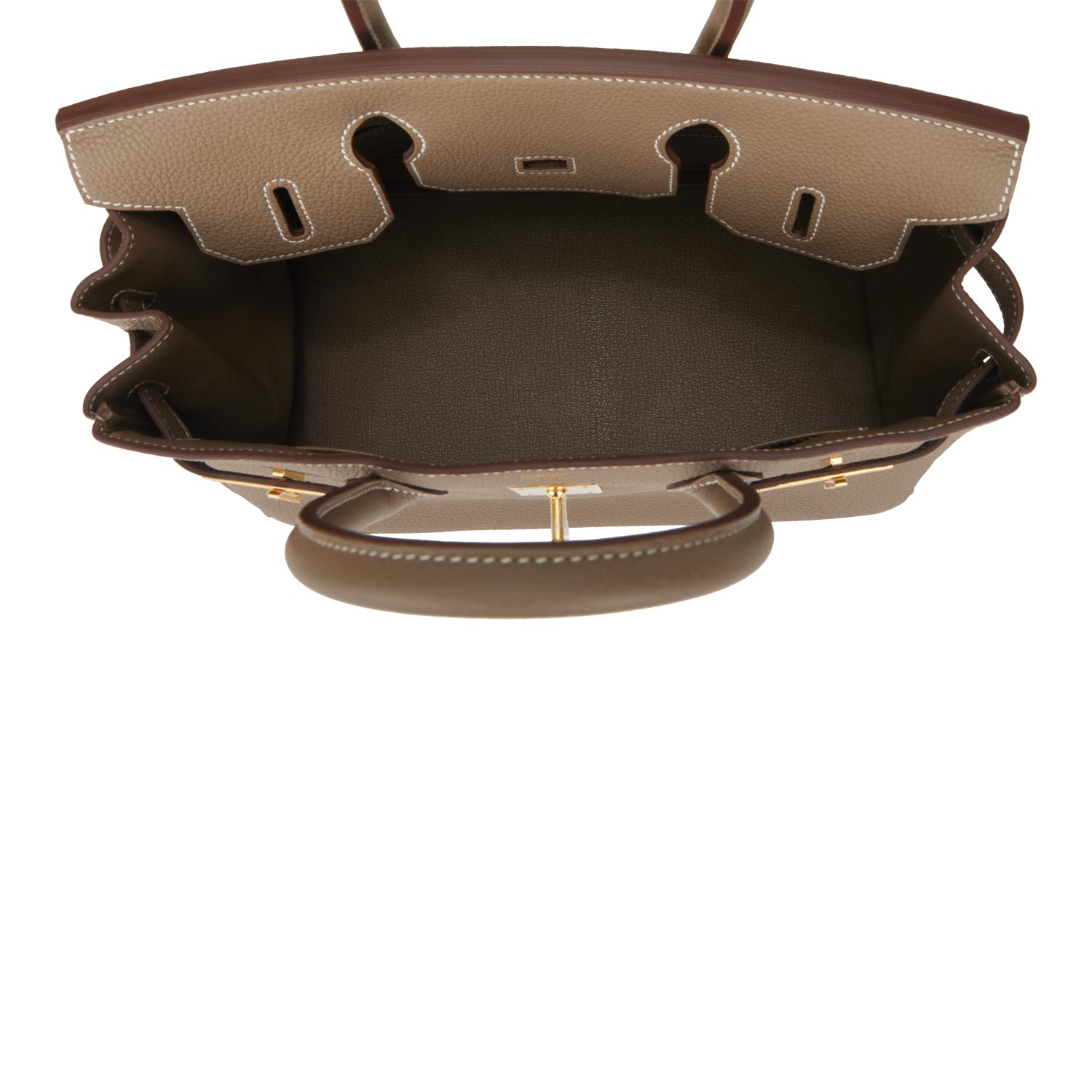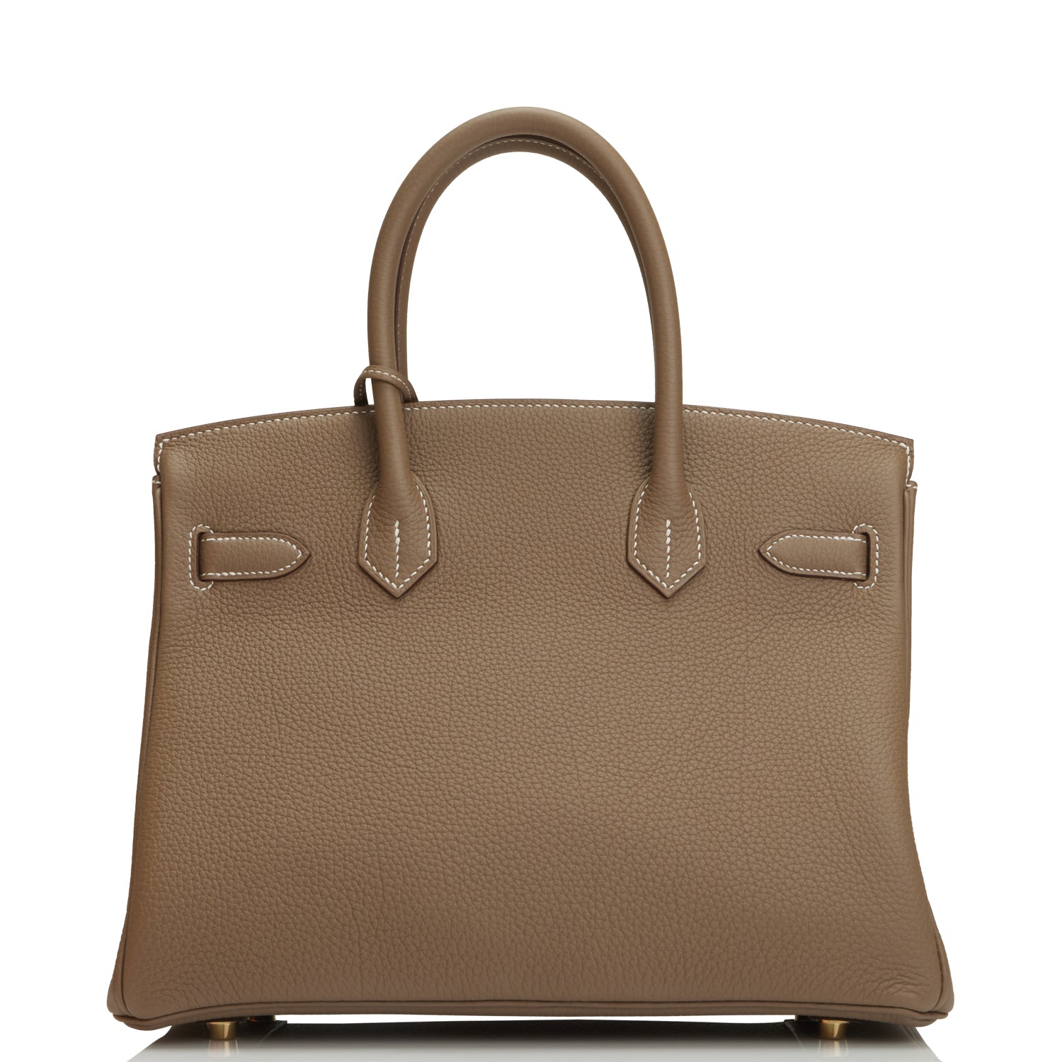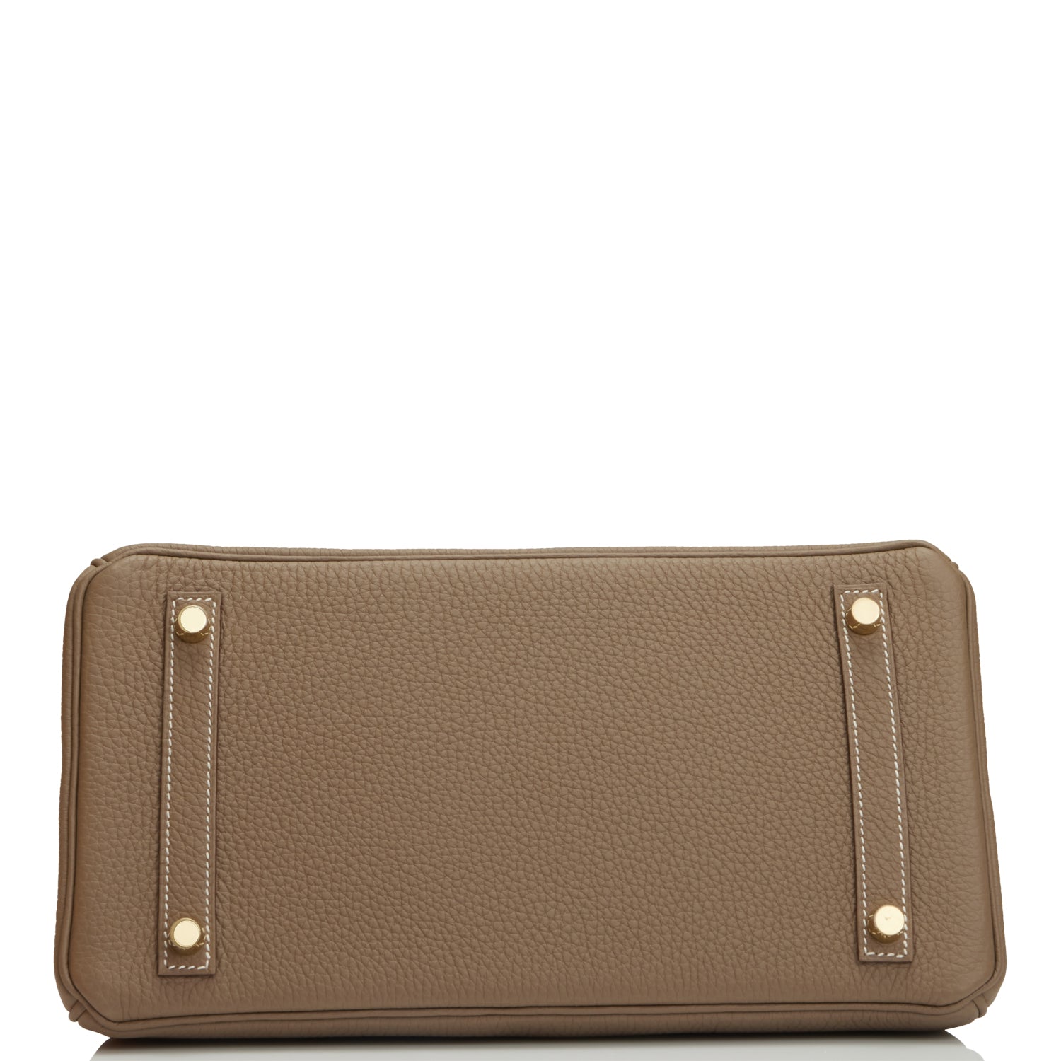 This Birkin is in Etoupe togo leather with gold hardware and has contrast stitching, two straps with front toggle closure, clochette with lock and two keys and double rolled handles.