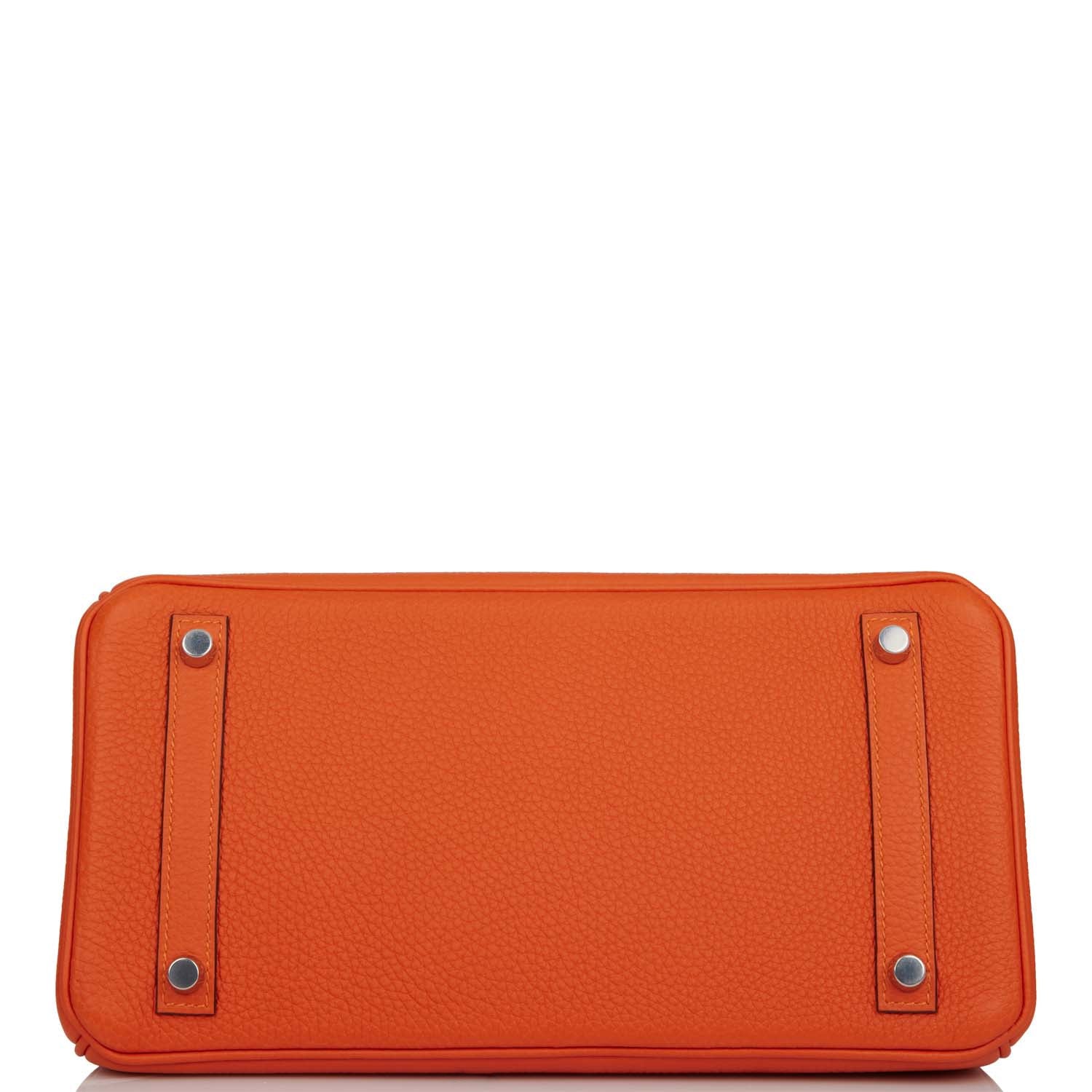 This Birkin bag is in Feu clemence leather with palladium hardware and features tonal stitching, front flap, two straps with center toggle closure, clochette with lock and two keys, and double rolled handles.