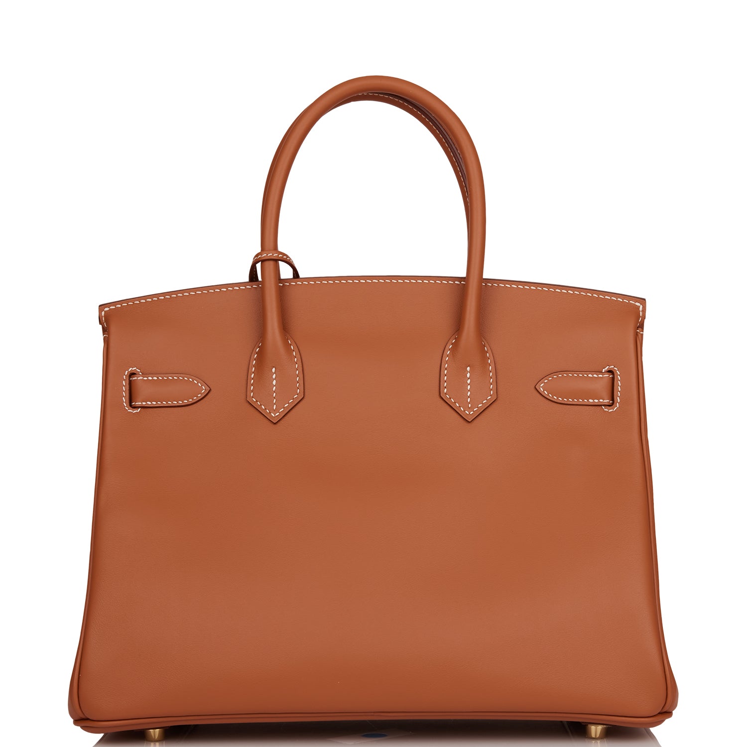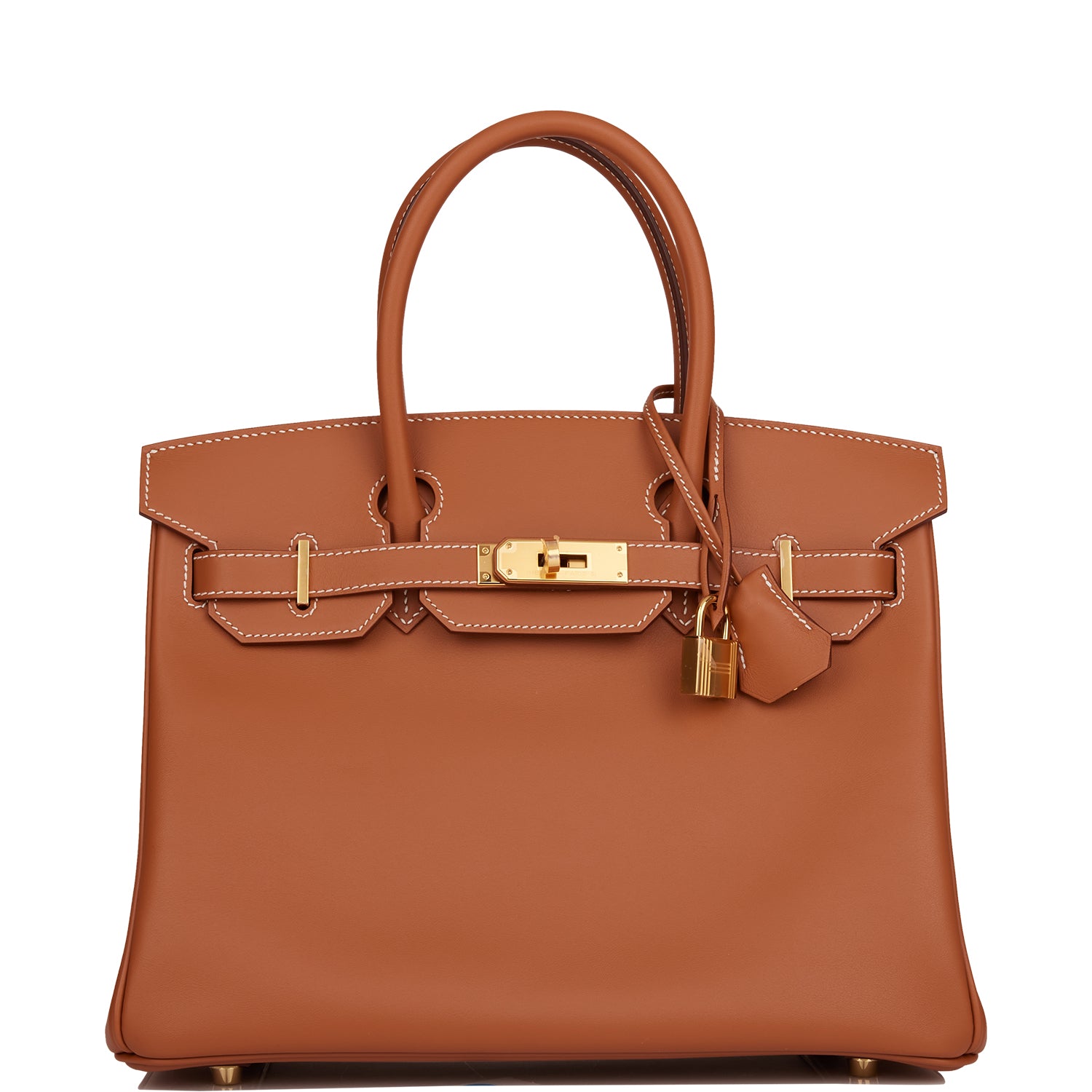 This Birkin is in gold Jonathan leather with gold hardware and has white contrast stitching, front flap, two straps with center toggle closure, clochette with lock and two keys, and double rolled handles.