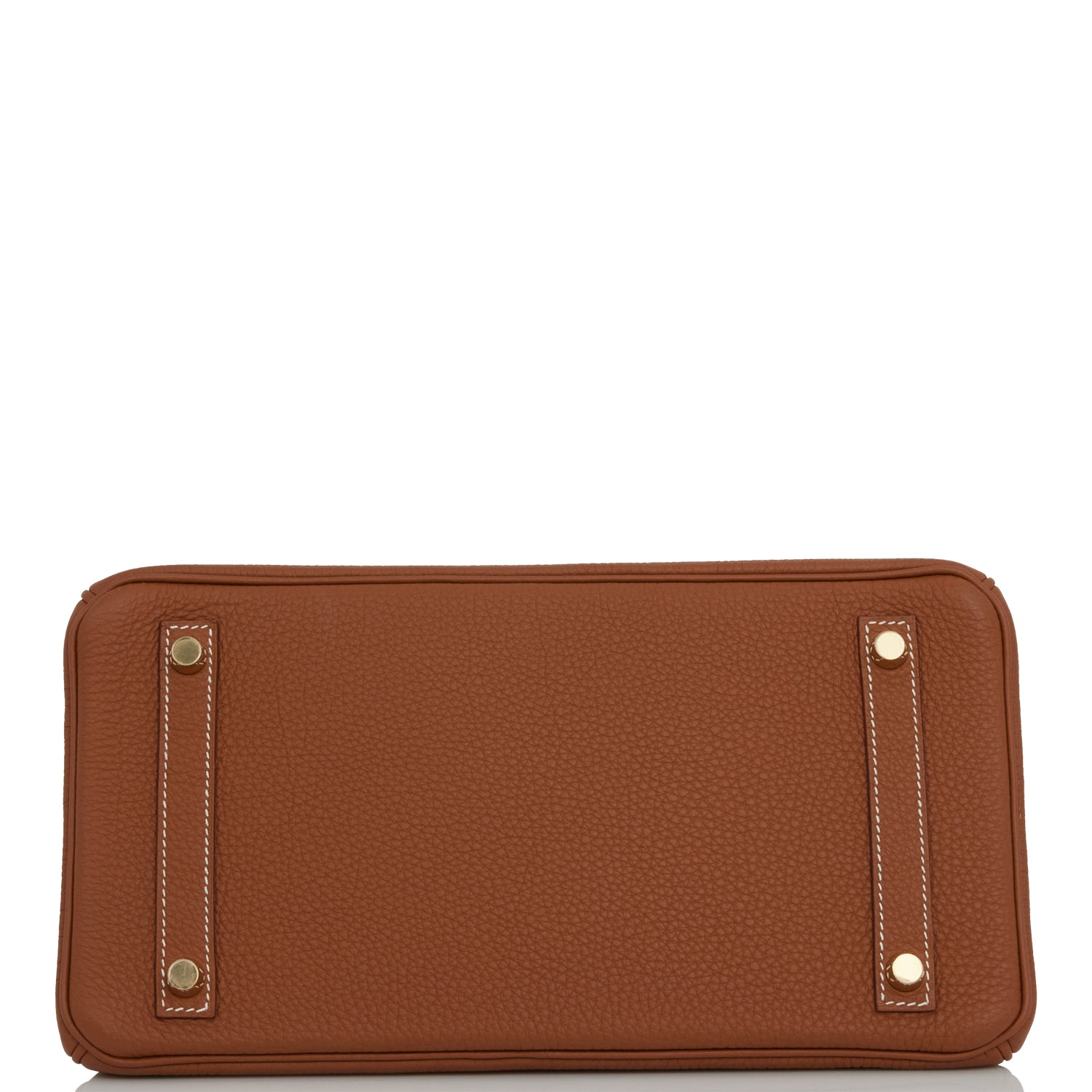 This Birkin is in gold togo leather with gold hardware and has white contrast stitching, front flap, two straps with center toggle closure, clochette with lock and two keys, and double rolled handles.