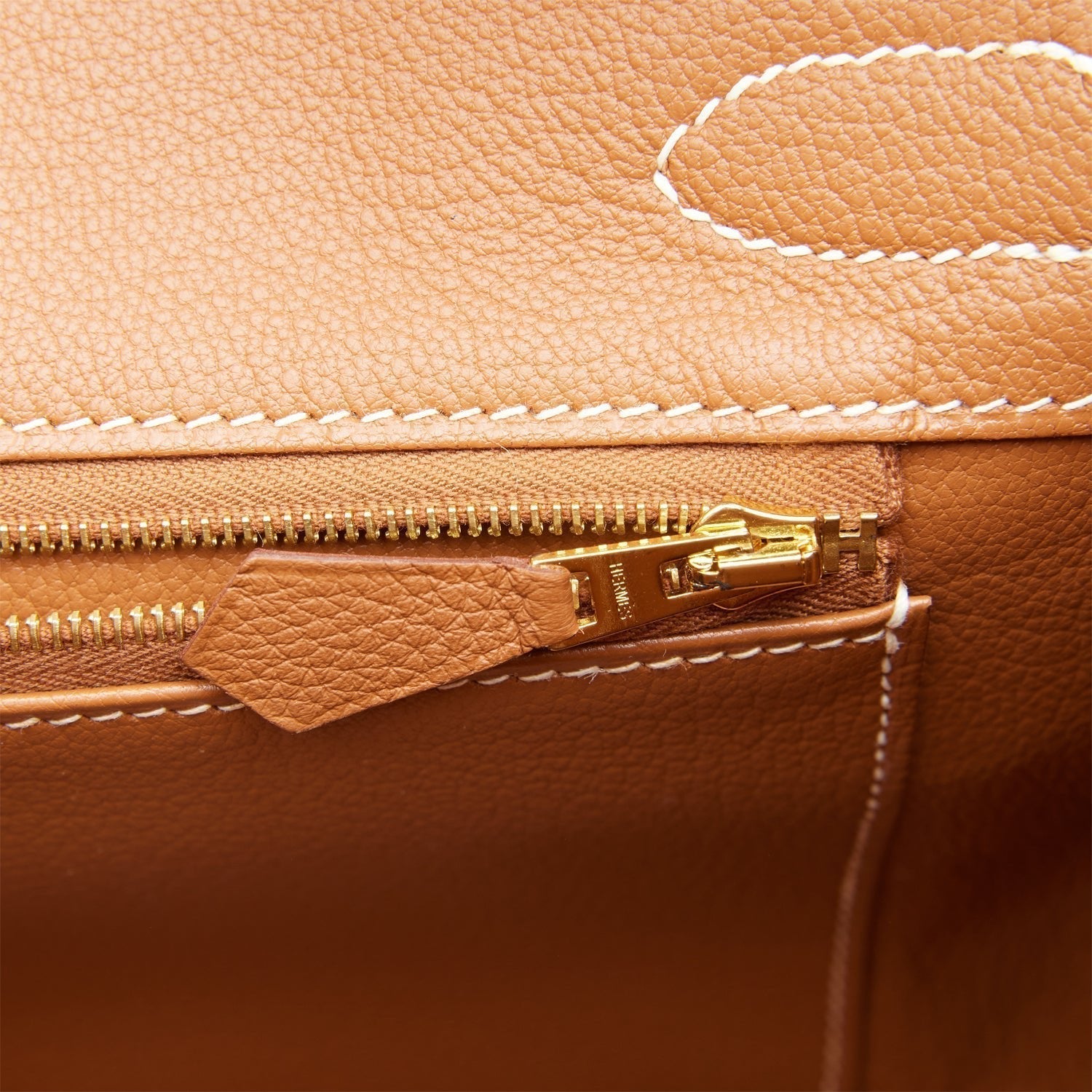 The interior is lined with Gold chevre and has one zip pocket with an Hermes engraved zipper pull and an open pocket on the opposite side.