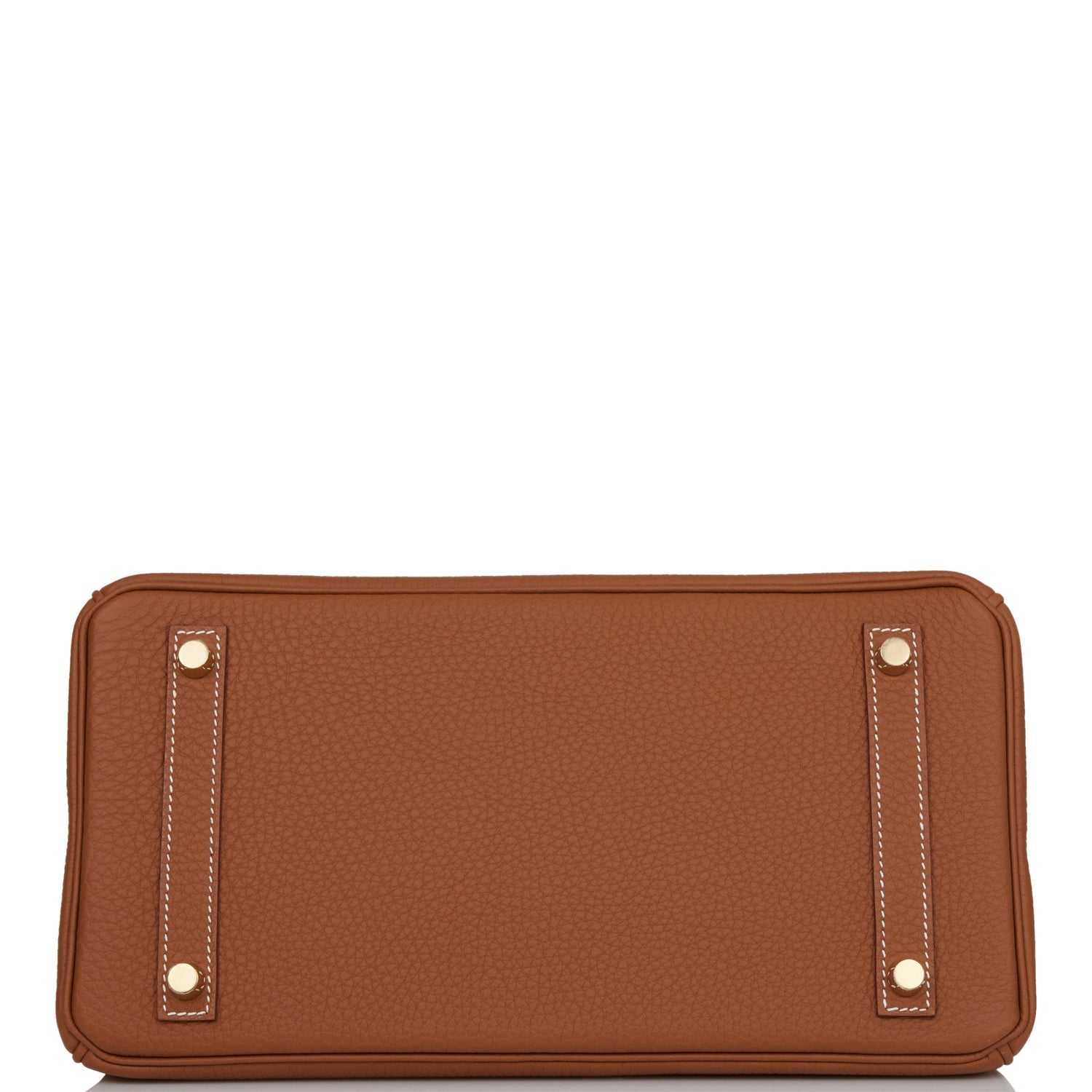 This Birkin is in gold togo leather with gold hardware and has white contrast stitching, front flap, two straps with center toggle closure, clochette with lock and two keys, and double rolled handles.