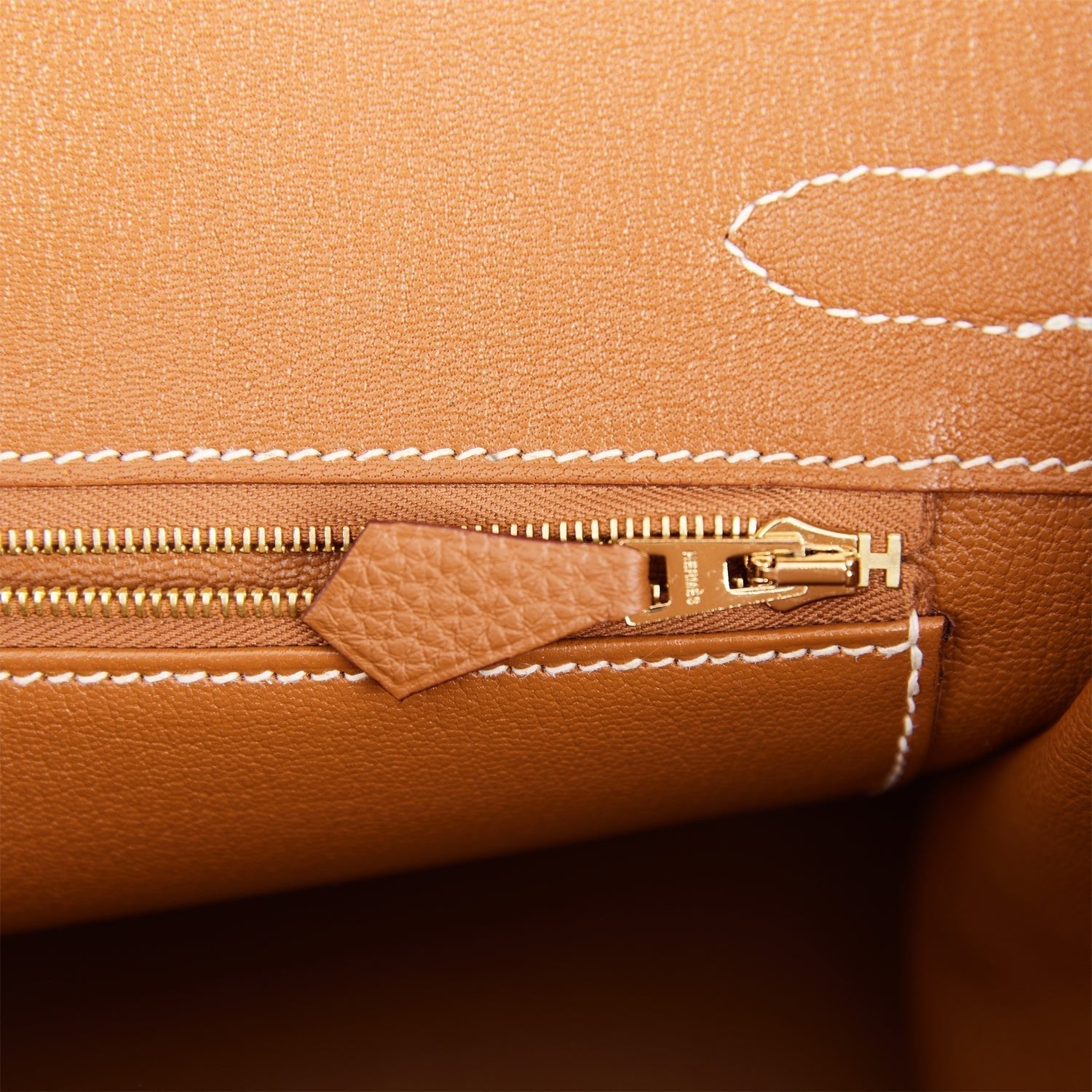 This Birkin is in gold togo leather with gold hardware and has white contrast stitching, front flap, two straps with center toggle closure, clochette with lock and two keys, and double rolled handles.