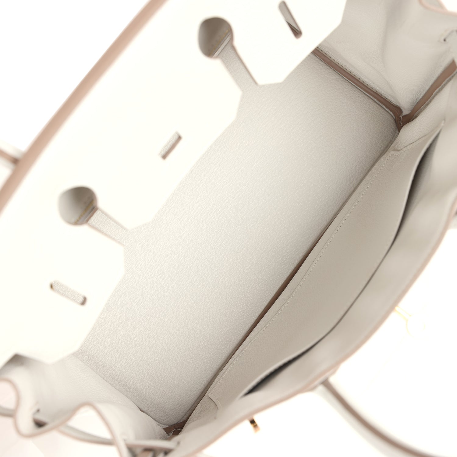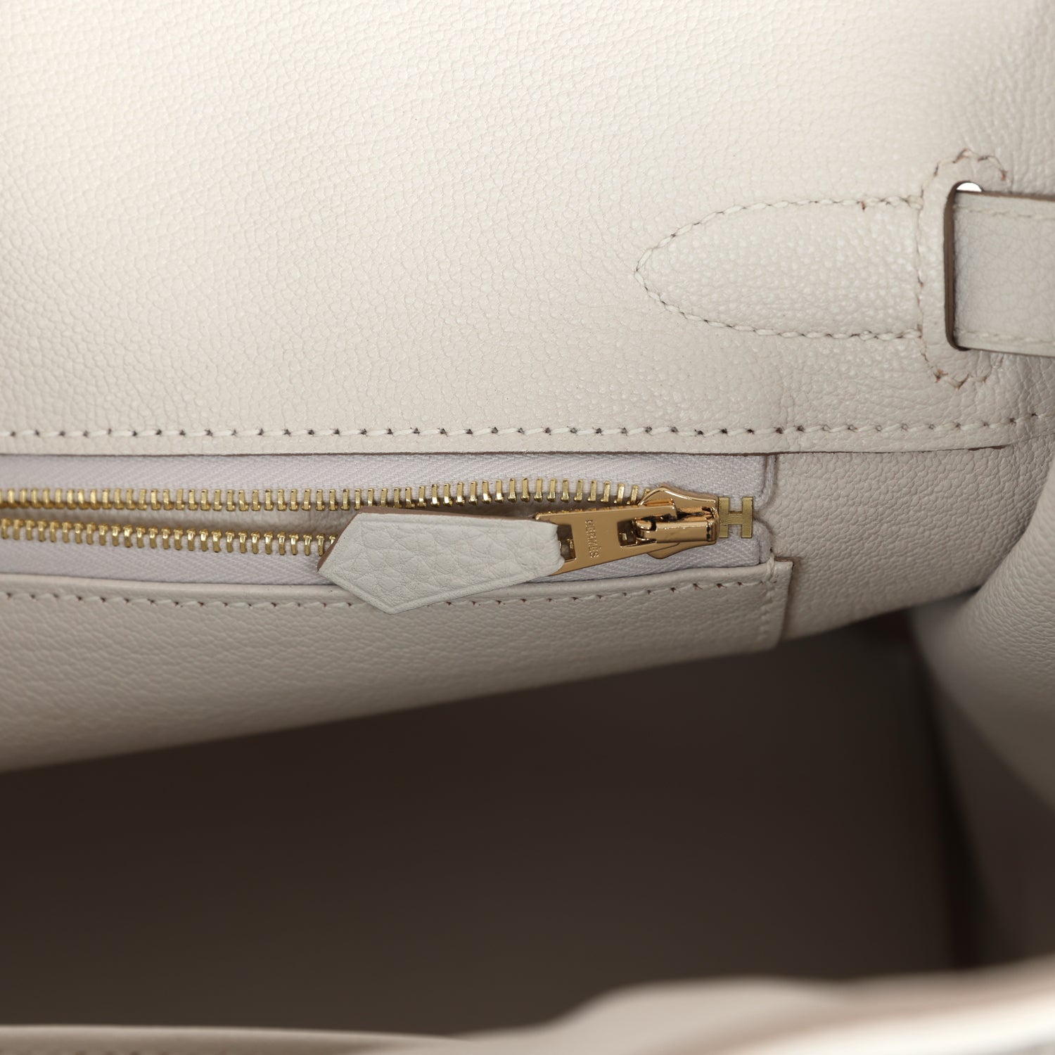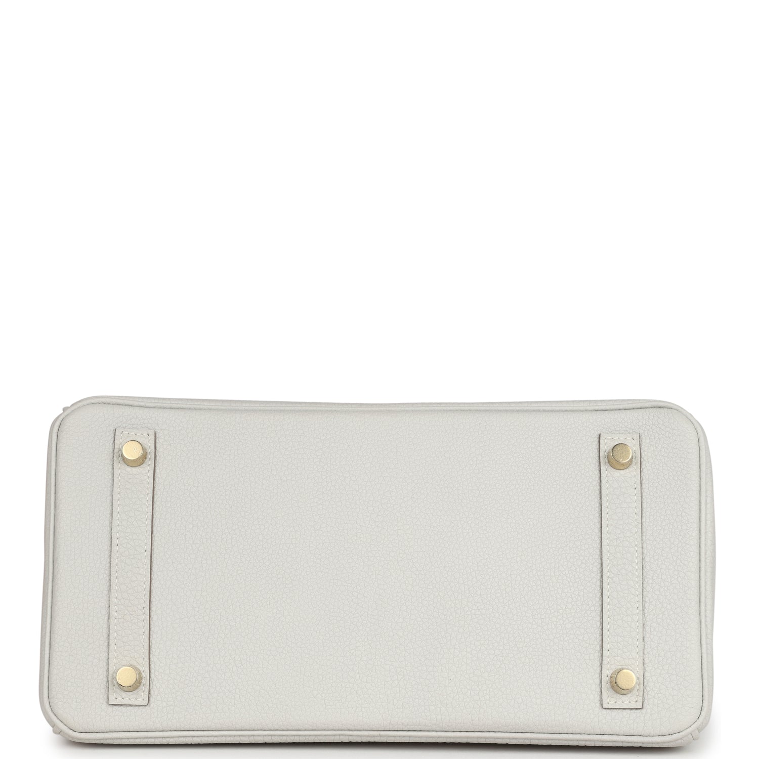 Birkin is in Gris Perle togo leather with gold hardware and has tonal stitching, front flap, two straps with center toggle closure, clochette with lock and two keys, and double rolled handles.