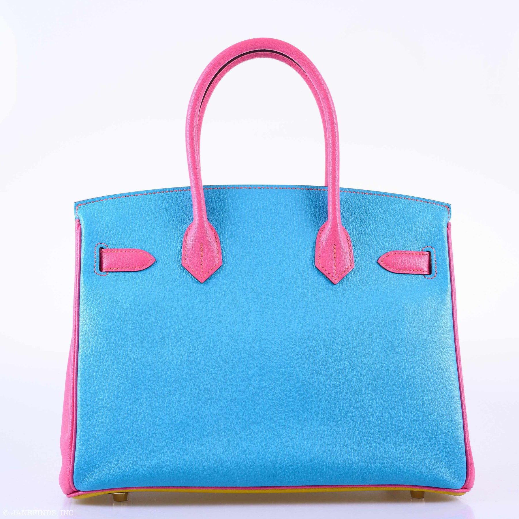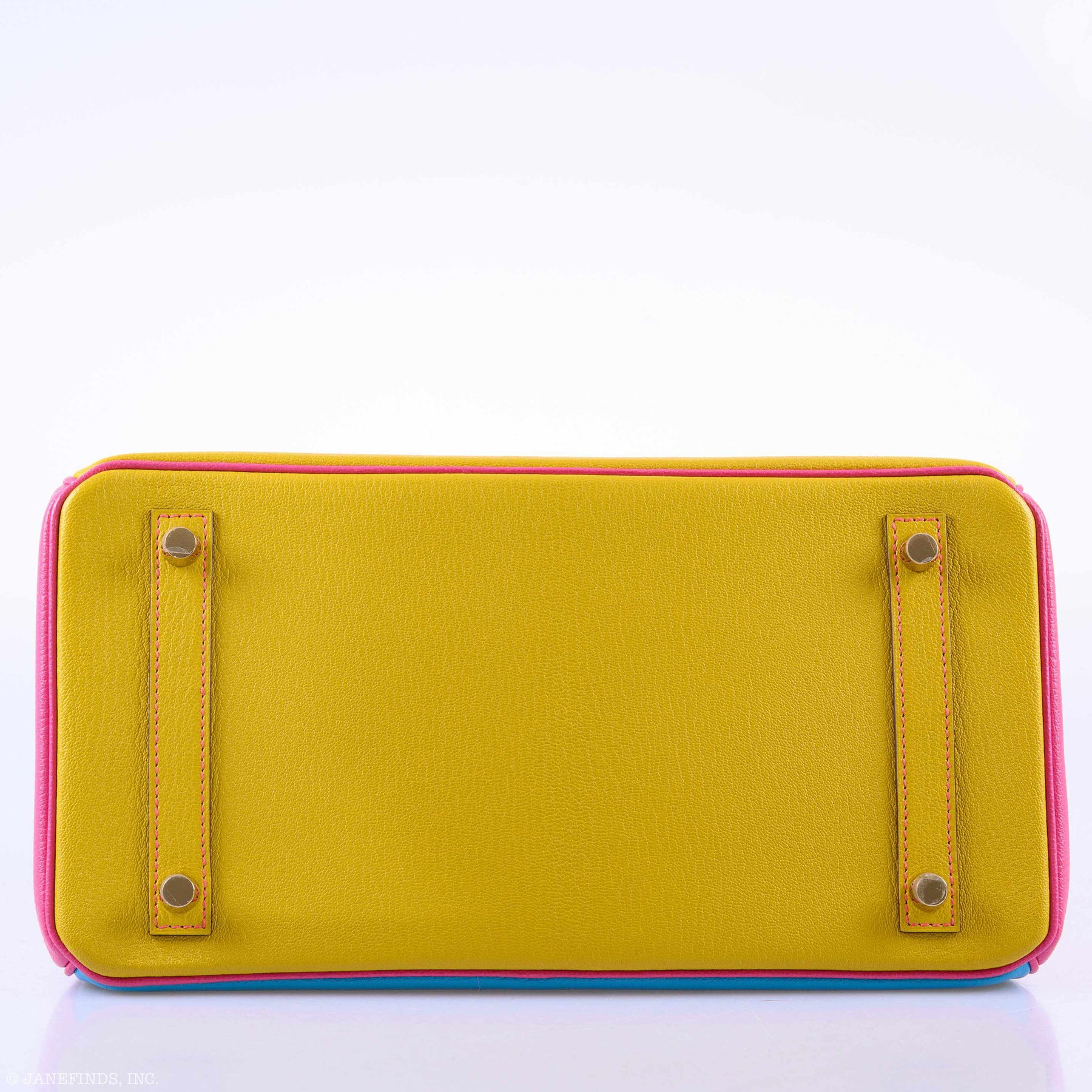 It was only a few years ago that Hermès stopped allowing special order bags with three colors, and already spotting one on the secondary market has become a rare experience. This neon 30cm Birkin is an excellent example of how fun those tri-color bags can be. Executed in Chevre leather, a glossy goat skin that displays color brilliantly and is reserved for HSS bags, this Birkin takes full advantage of the special order process, adding contrast stitching and brushed gold hardware to a body of Cumin, Blue Aztec, and Rose Lipstick. Still in fresh condition as though it was just recently produced, this exciting Birkin is a very special and truly unusual piece.