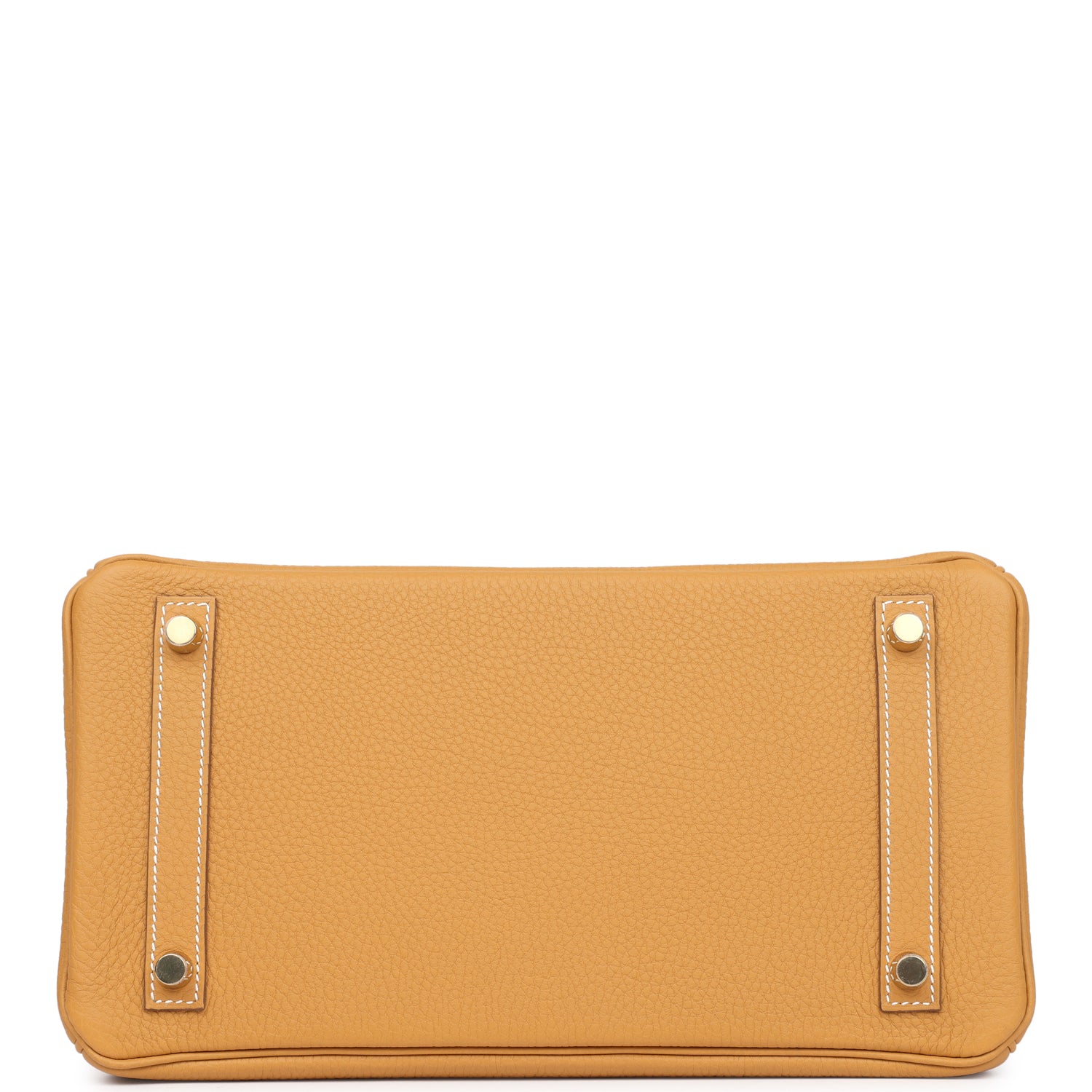 Birkin is in Natural Sable togo leather with gold hardware and has contrast stitching, front flap, two straps with center toggle closure, clochette with lock and two keys, and double rolled handles.