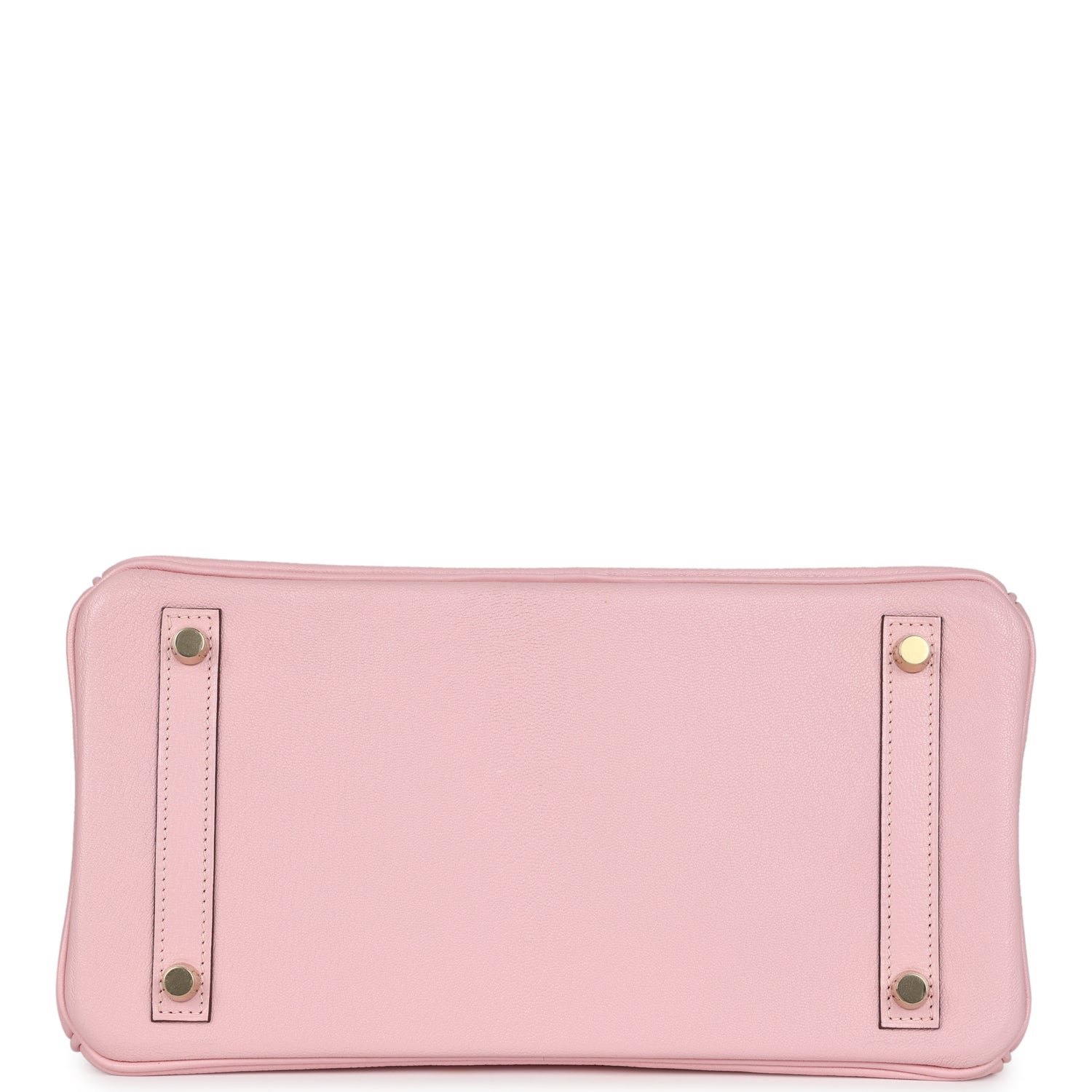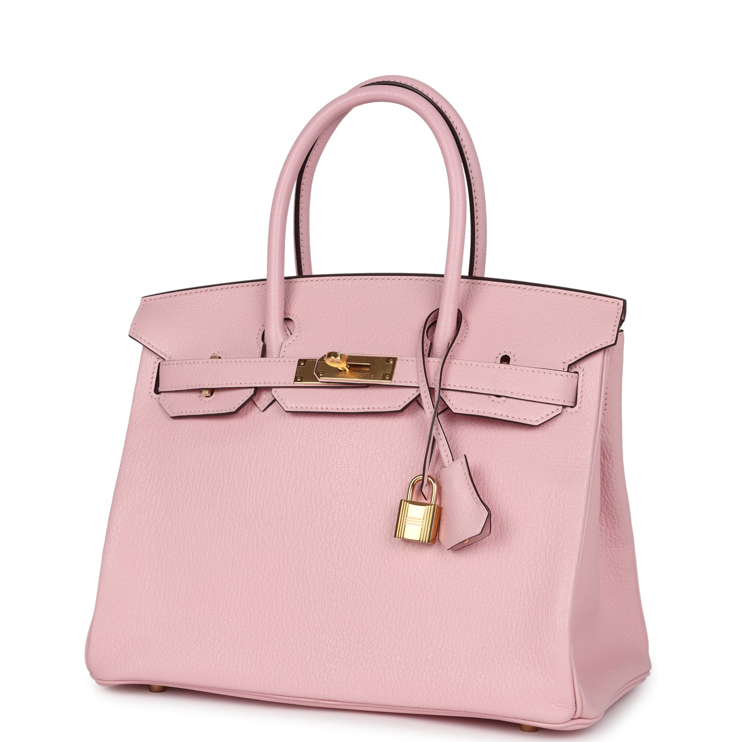 Birkin is in Rose Sakura chevre mysore leather with gold hardware, featuring tonal stitching, front flap, two straps with center toggle closure, clochette with lock and two keys, and double rolled handles.
