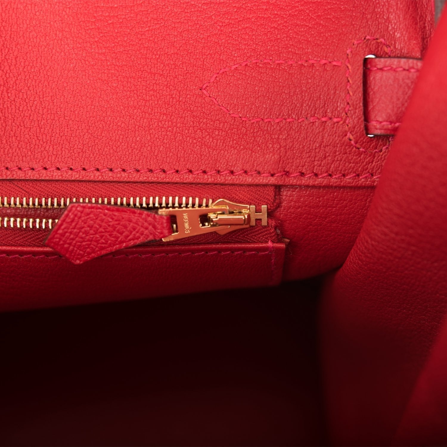 This Birkin is in Rouge Casaque epsom leather with gold hardware and has tonal stitching, front flap, two straps with center toggle closure, clochette with lock and two keys, and double rolled handles.