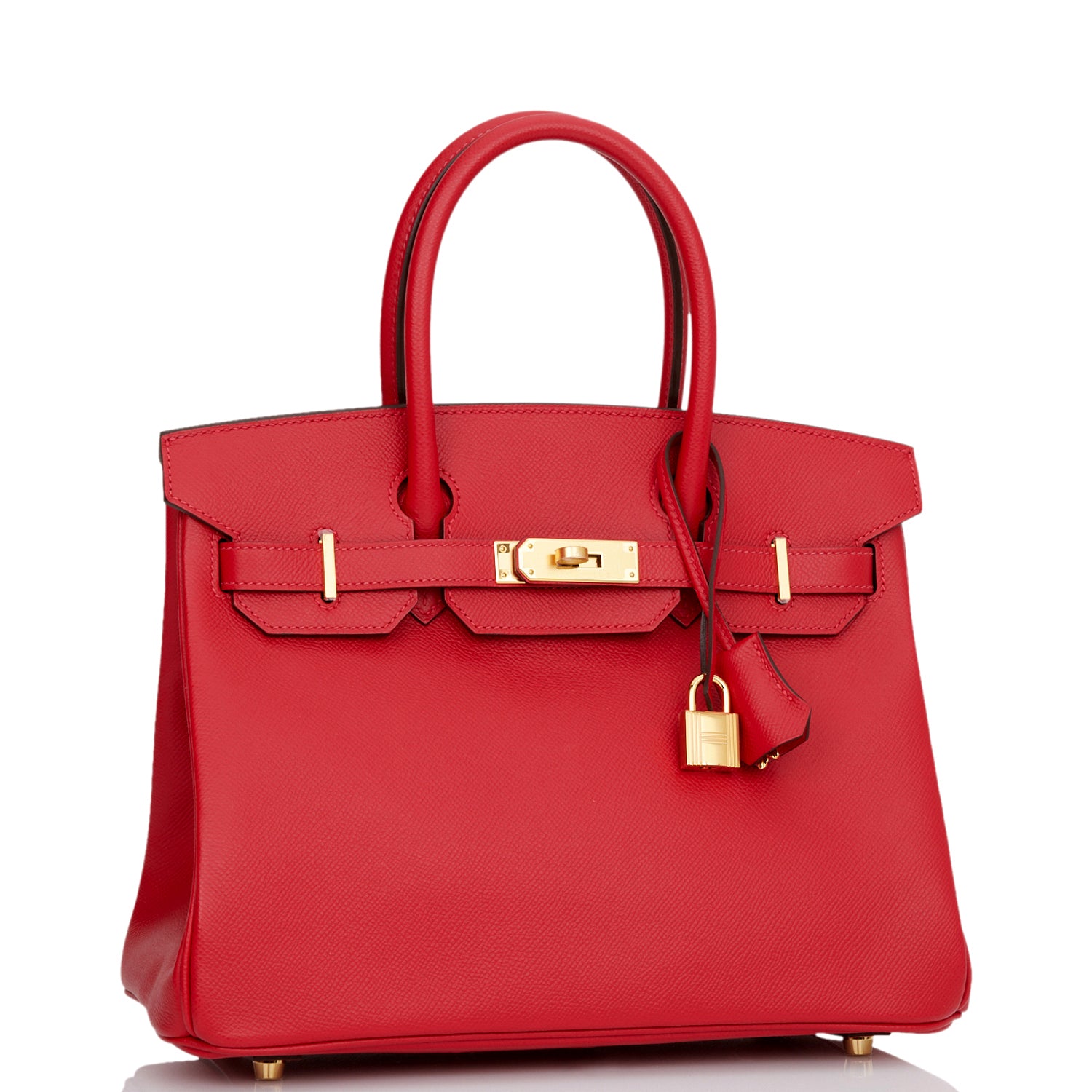 This Birkin is in Rouge Casaque epsom leather with gold hardware and has tonal stitching, front flap, two straps with center toggle closure, clochette with lock and two keys, and double rolled handles.