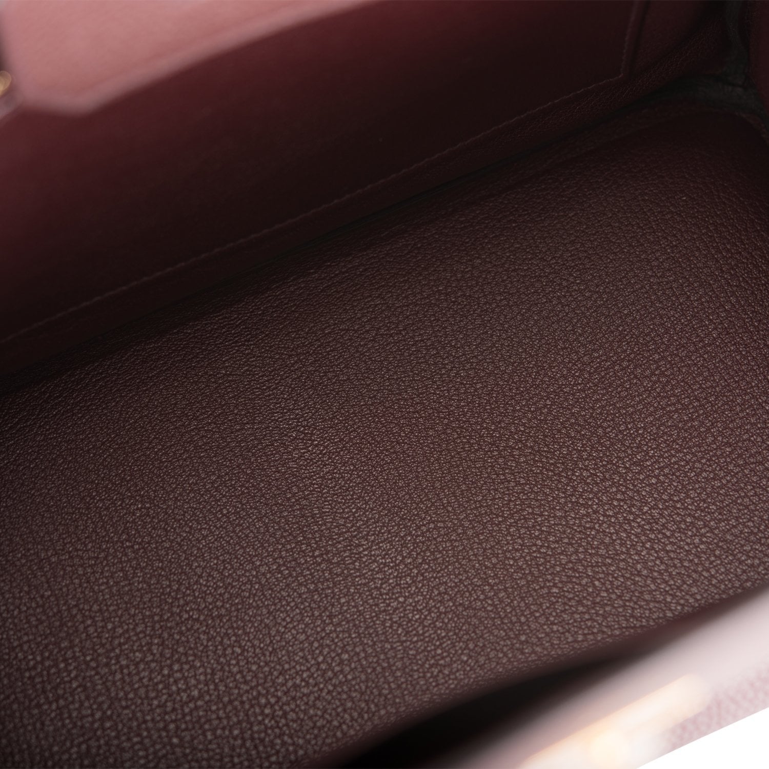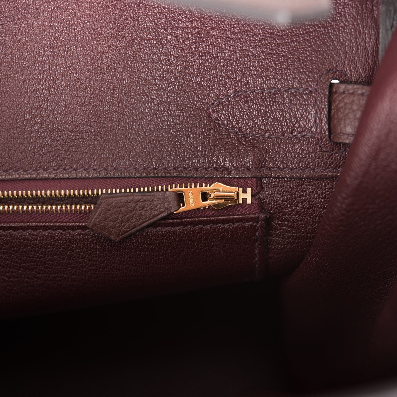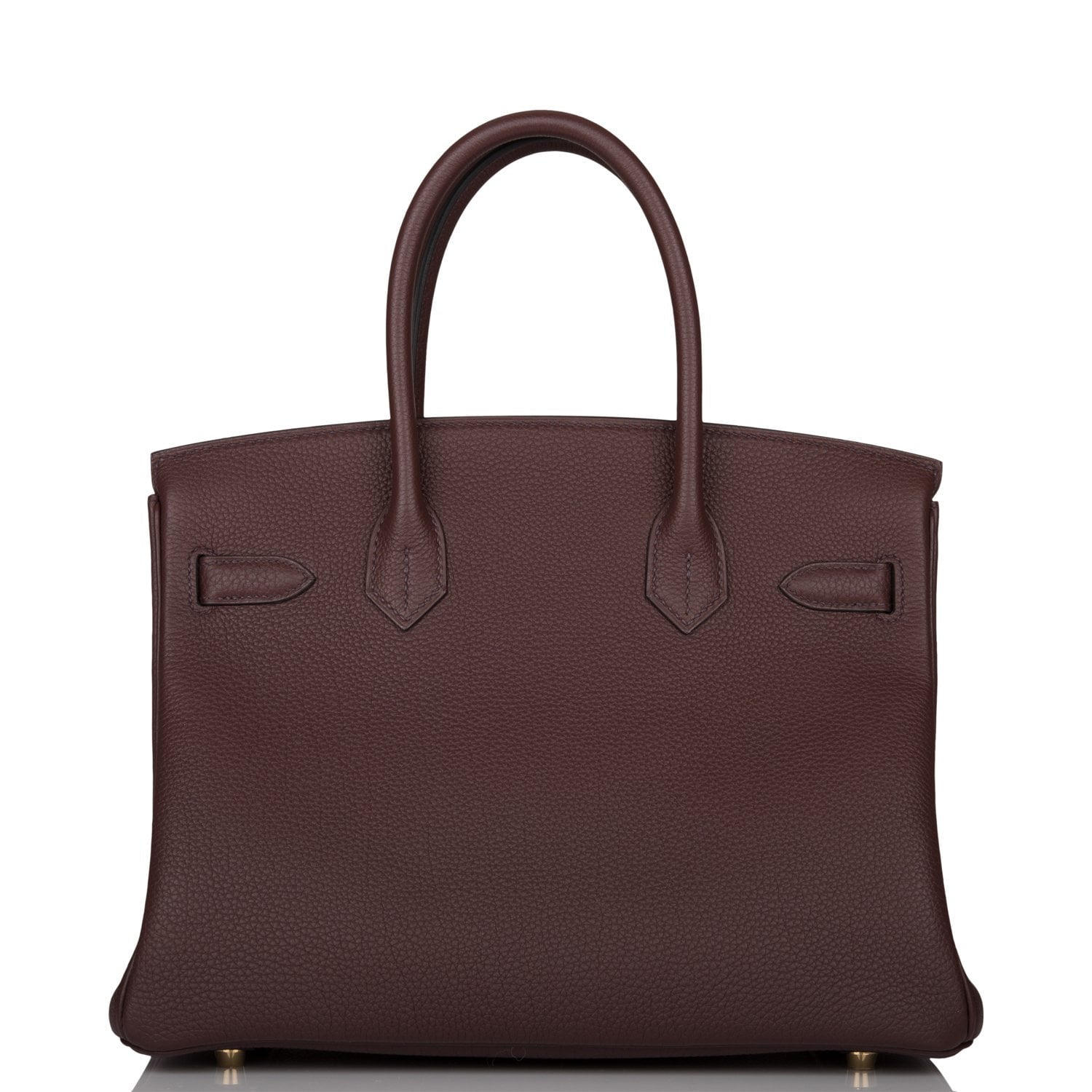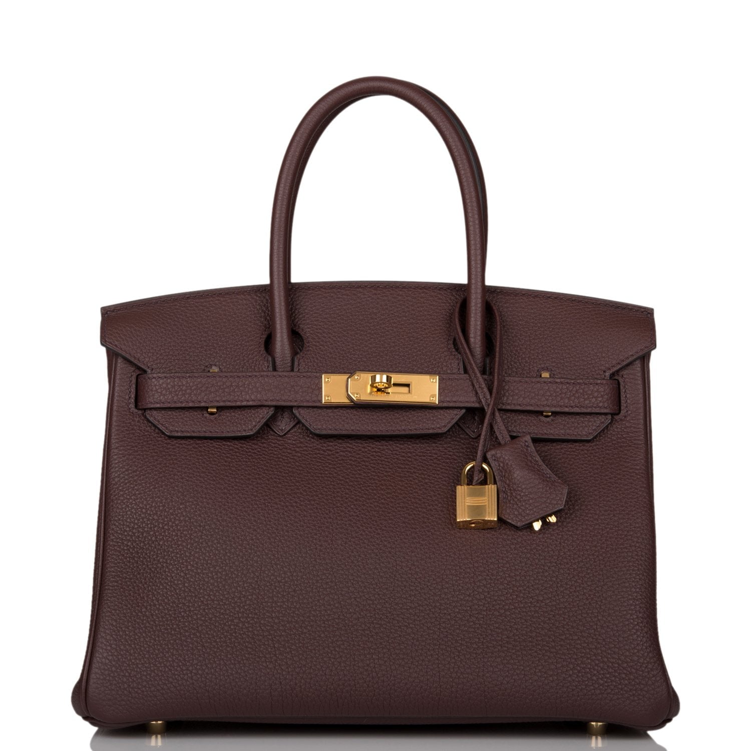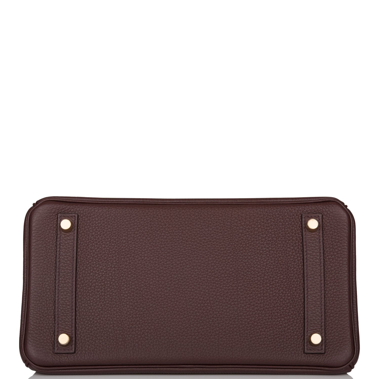 This Birkin is in Rouge Sellier togo leather with gold hardware and has tonal stitching, front flap, two straps with center toggle closure, clochette with lock and two keys, and double rolled handles.