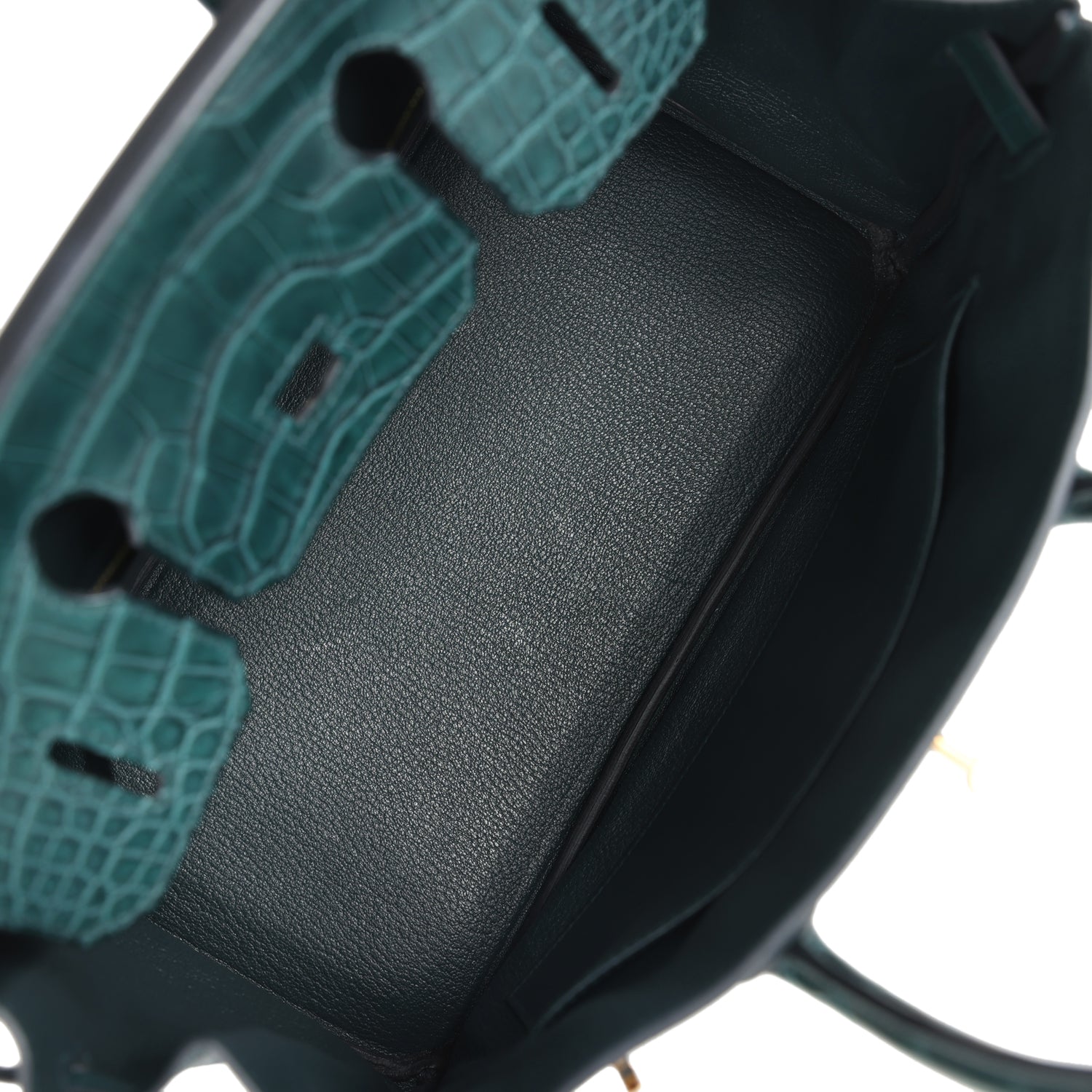 The interior is lined with Vert Cypres chevre and has a zip pocket with an Hermes engraved zipper pull and an open pocket on the opposite side.
