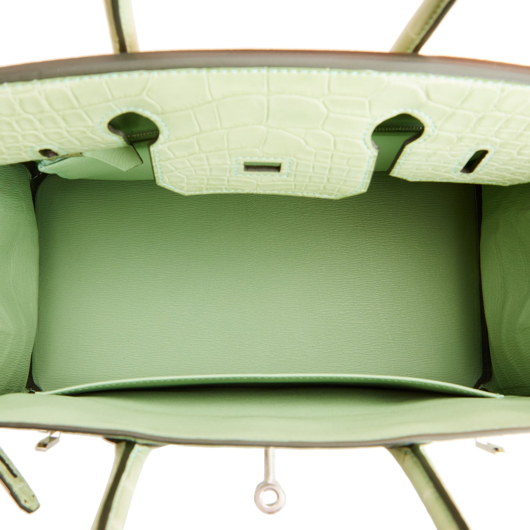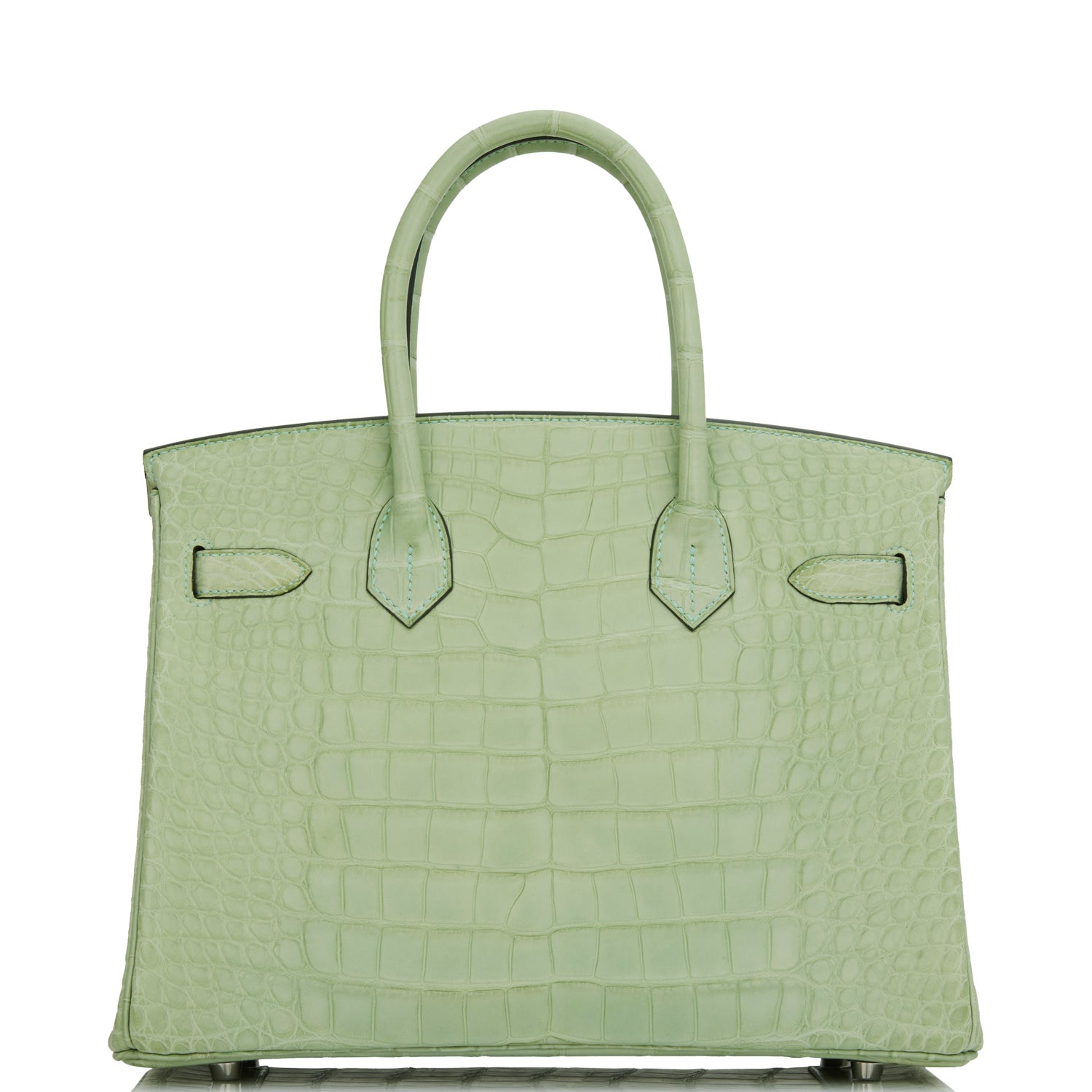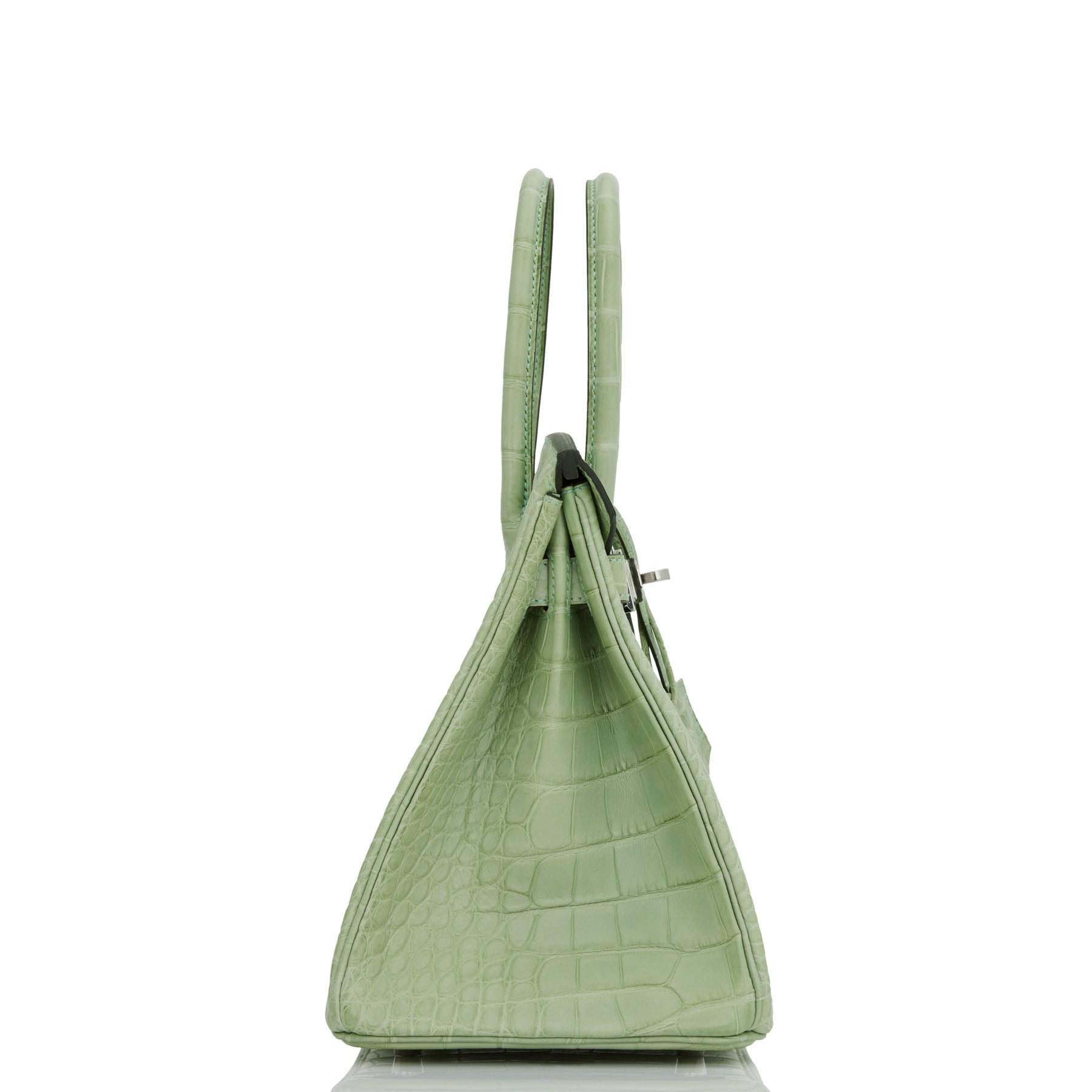 This Birkin is in Vert D'Eau matte Mississippienis alligator leather with palladium hardware and has tonal stitching, front strap, two straps with center toggle closure, clochette with lock and two keys and double rolled handles.