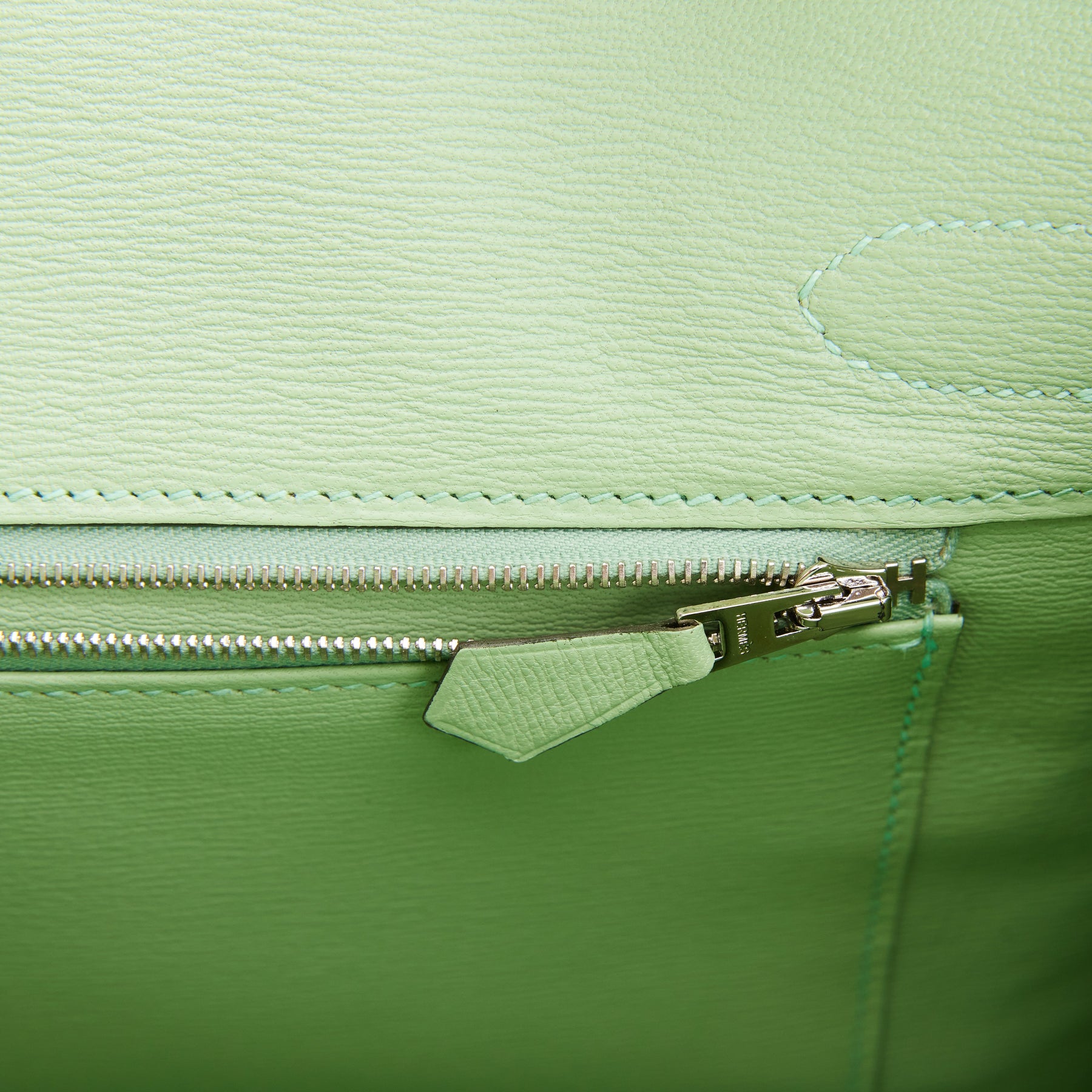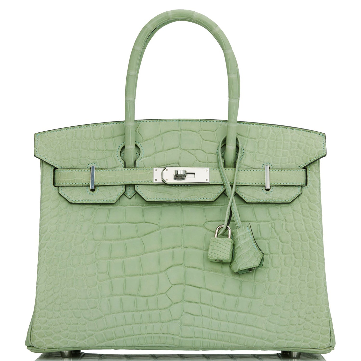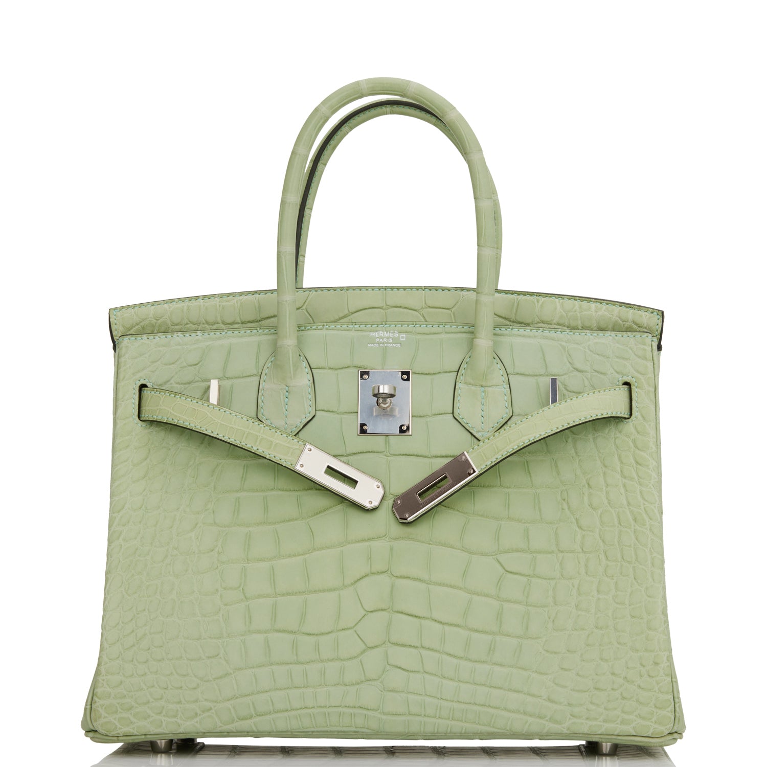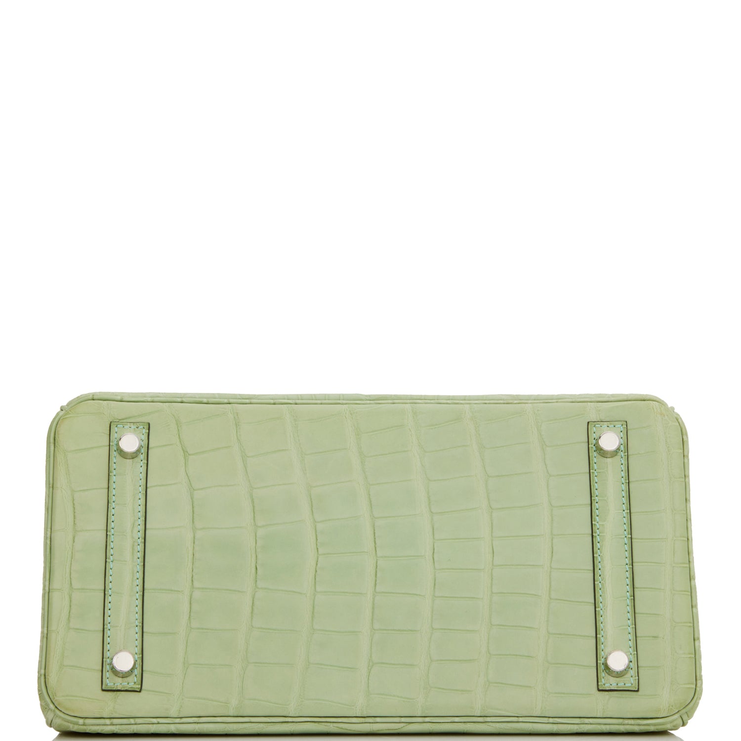 This Birkin is in Vert D'Eau matte Mississippienis alligator leather with palladium hardware and has tonal stitching, front strap, two straps with center toggle closure, clochette with lock and two keys and double rolled handles.