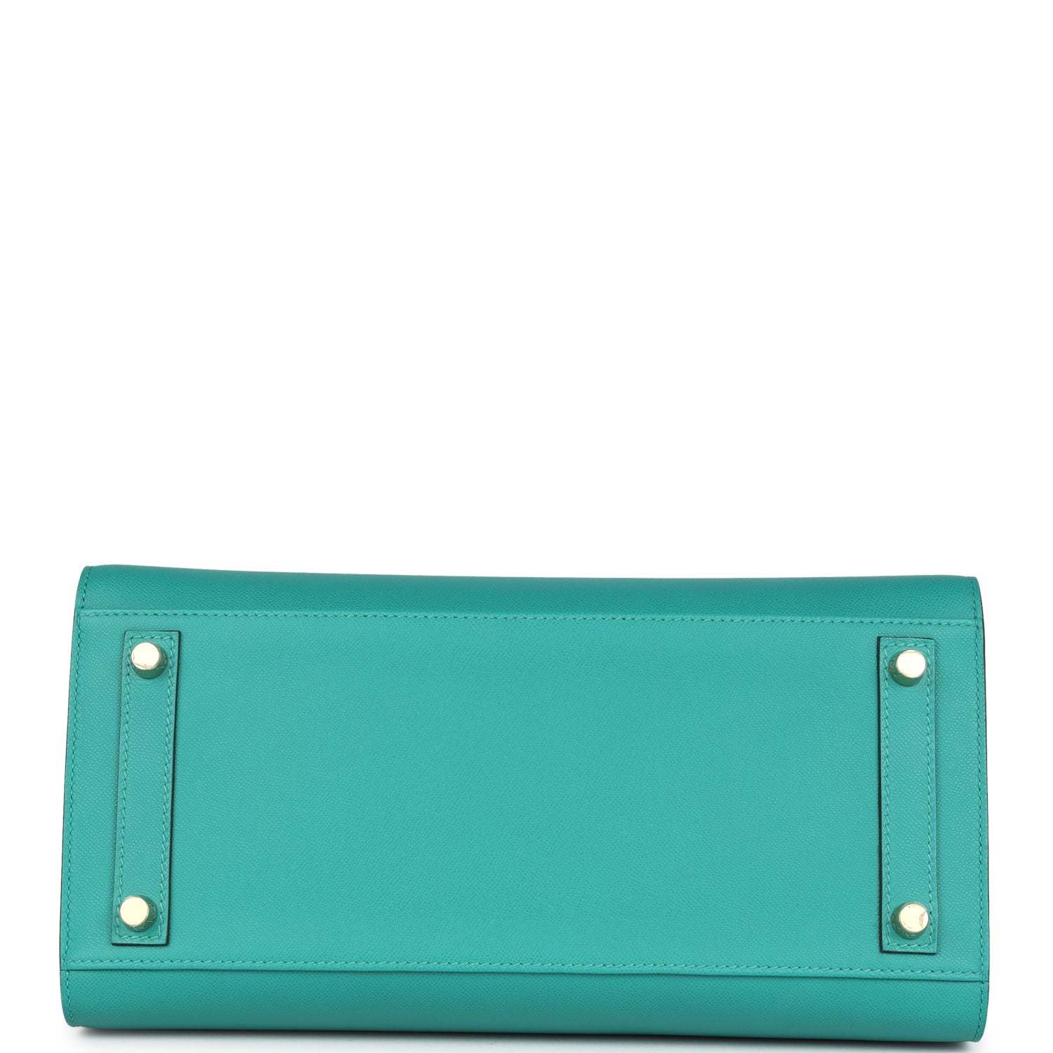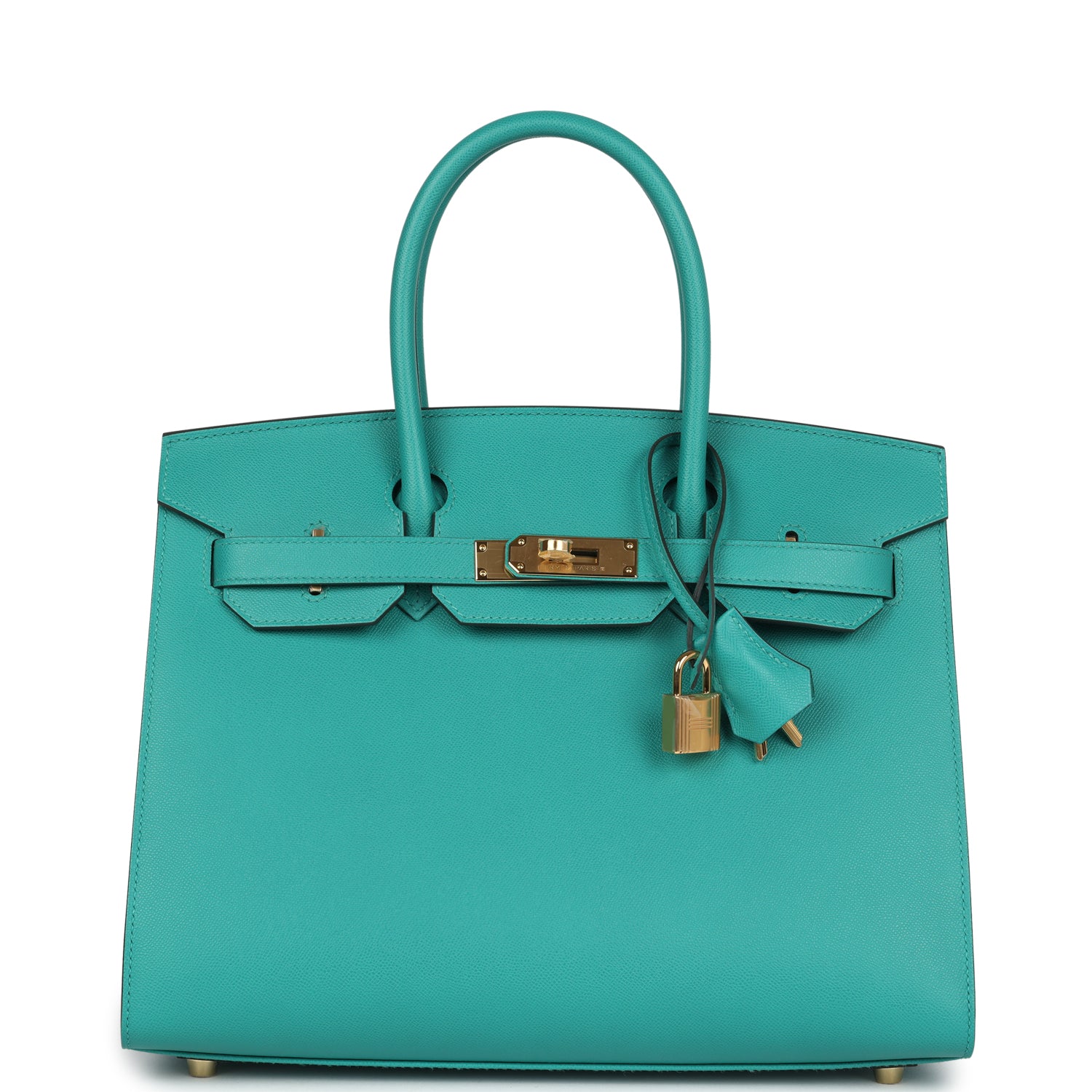 This Birkin is in Vert Verone Madame leather with gold hardware and has tonal stitching, front flap, two straps with center toggle closure, clochette with lock and two keys, and double rolled handles.