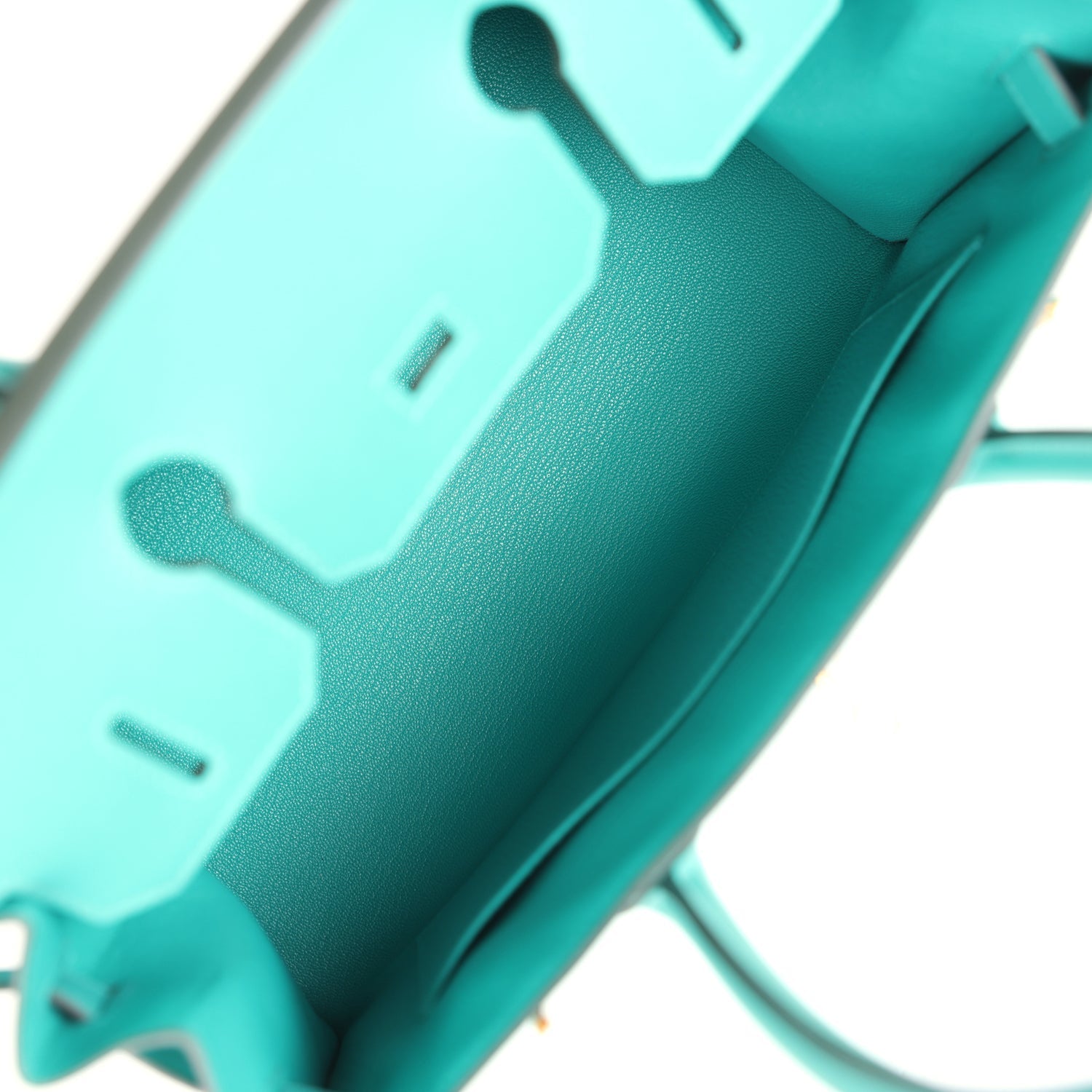 The interior is lined with Vert Verone chevre and has one zip pocket with an Hermes engraved zipper pull and an open pocket on the opposite side.