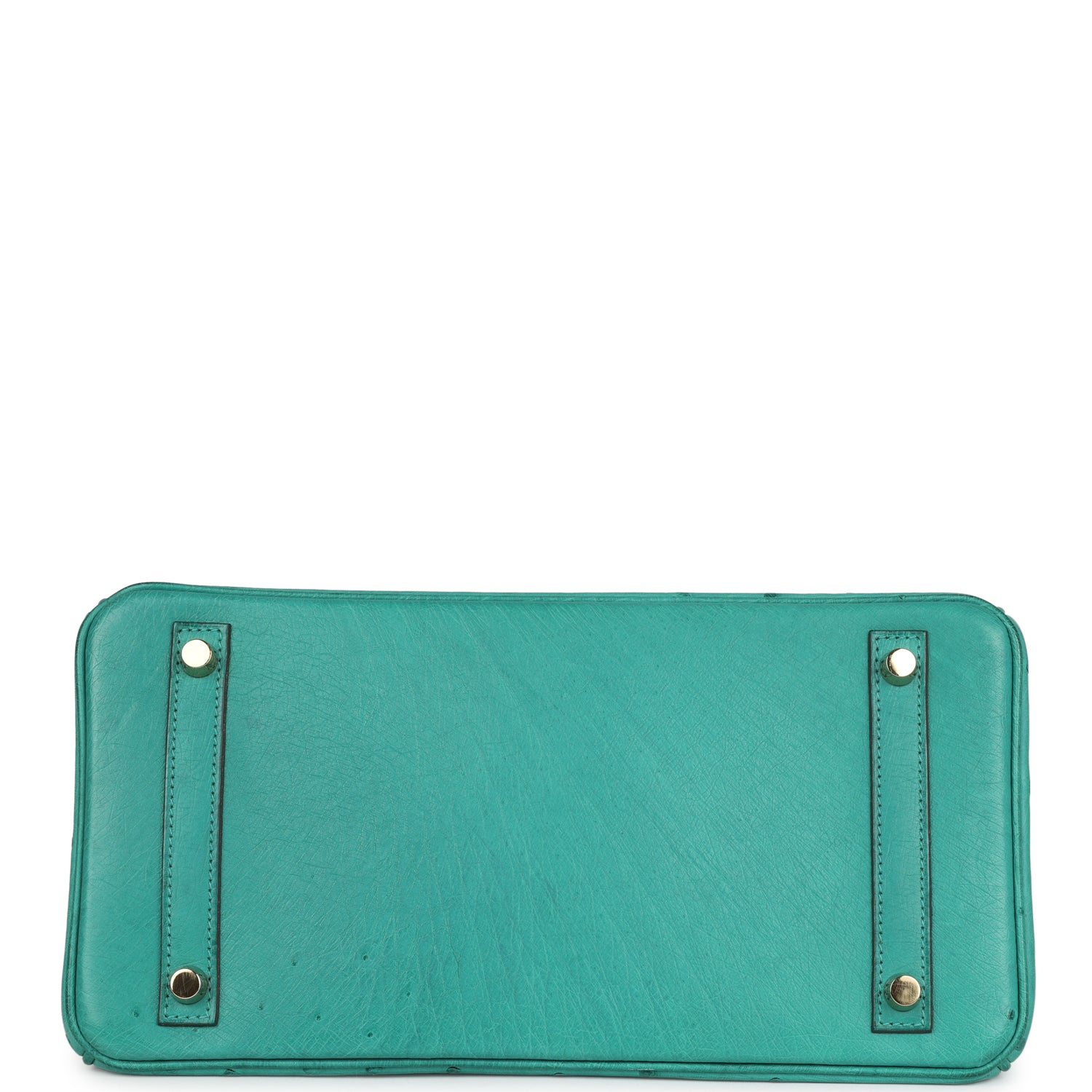 Birkin is in Vert Verone ostrich leather with gold hardware and features tonal stitching, front flap, two straps with center toggle closure, clochette with lock and two keys, and double rolled handles.