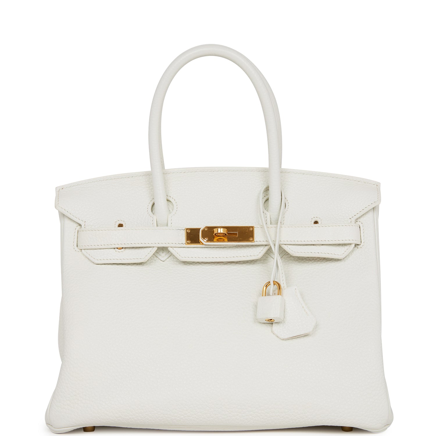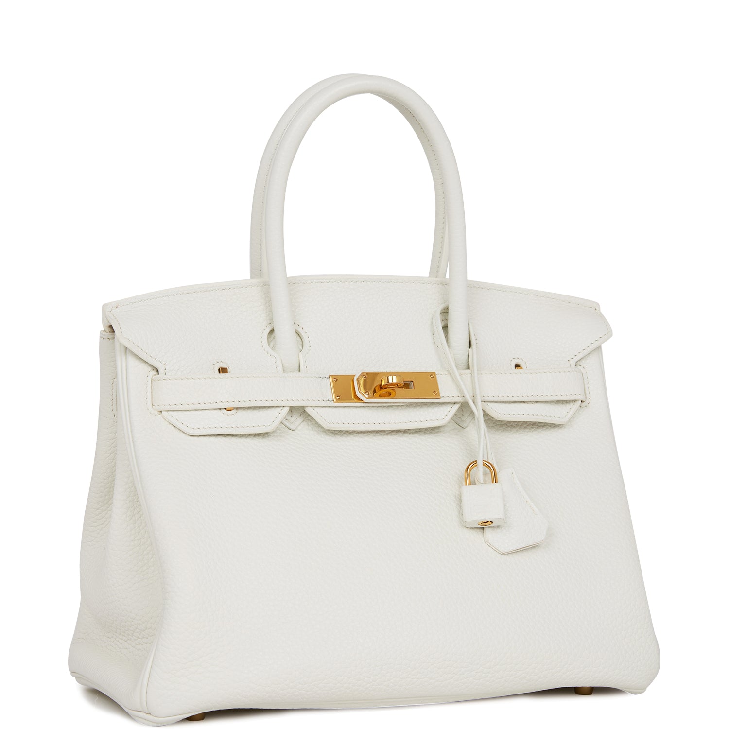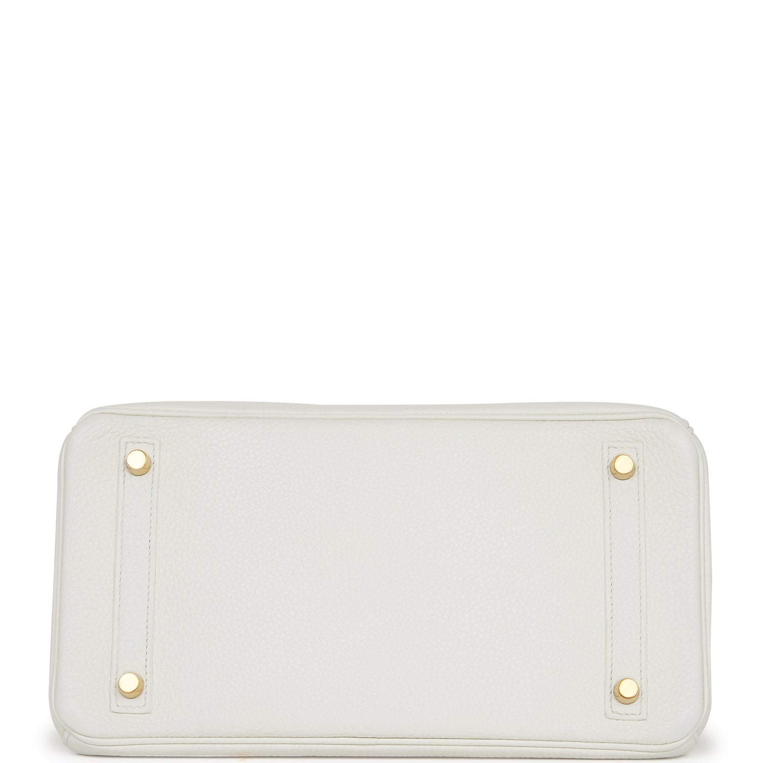 This Birkin is in White clemence leather with gold hardware and has tonal stitching, a front toggle closure, a clochette with lock and two keys, and double rolled handles.