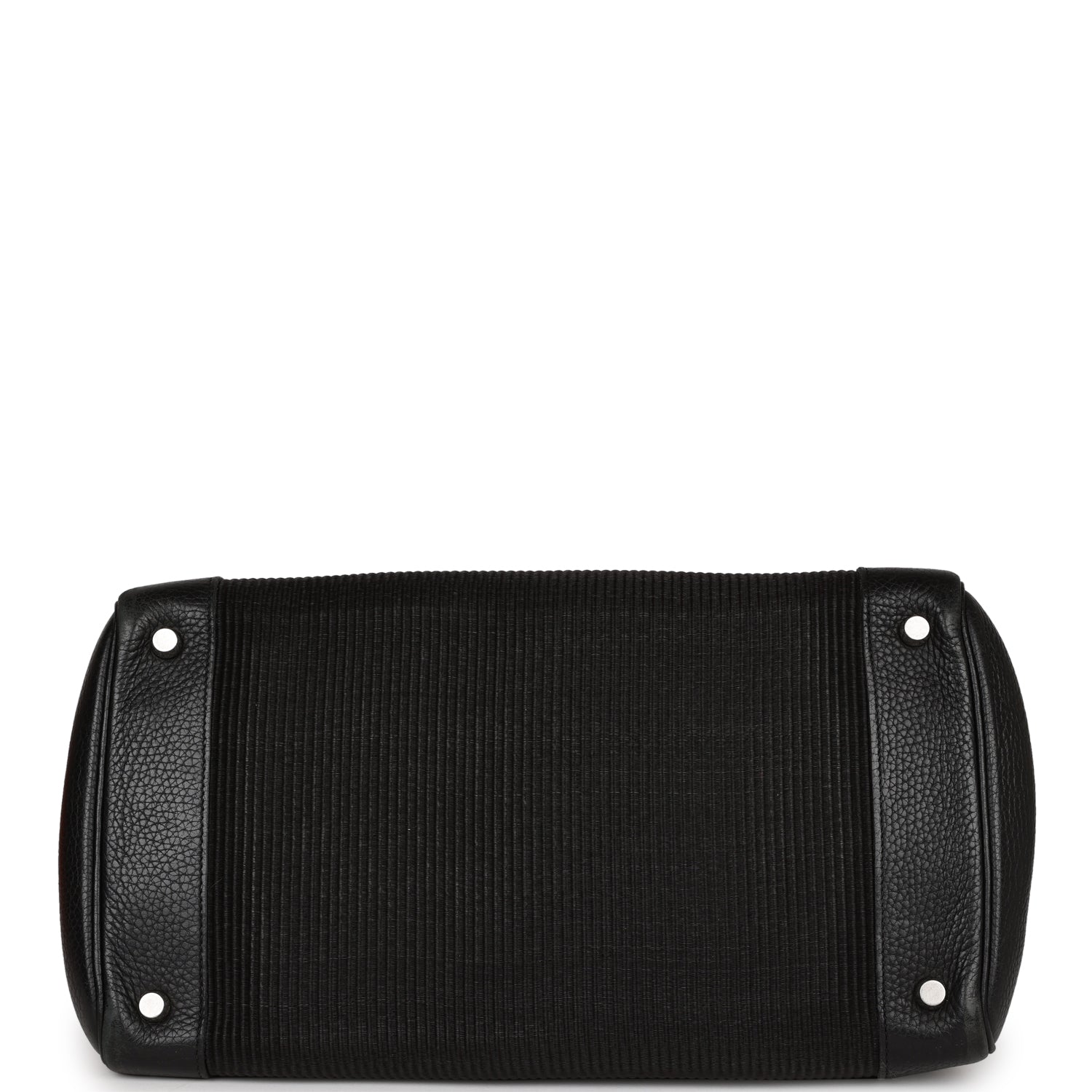 This Birkin is in black crinoline and clemence leather with palladium hardware and has tonal stitching, front flap, two straps with center toggle closure, clochette with lock and two keys, and double rolled handles.