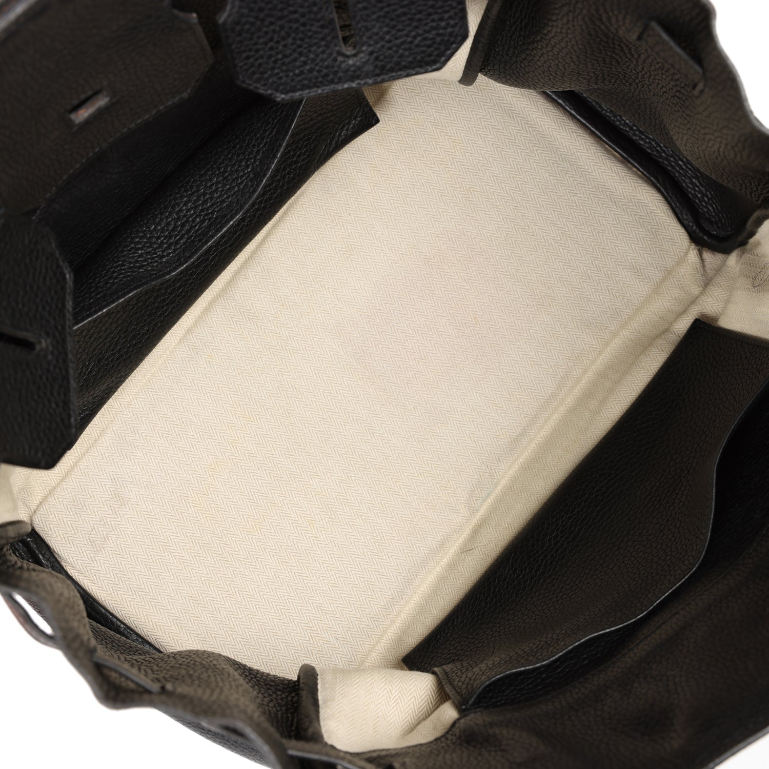 The interior is lined with black chevre and toile and has two slip pockets.
