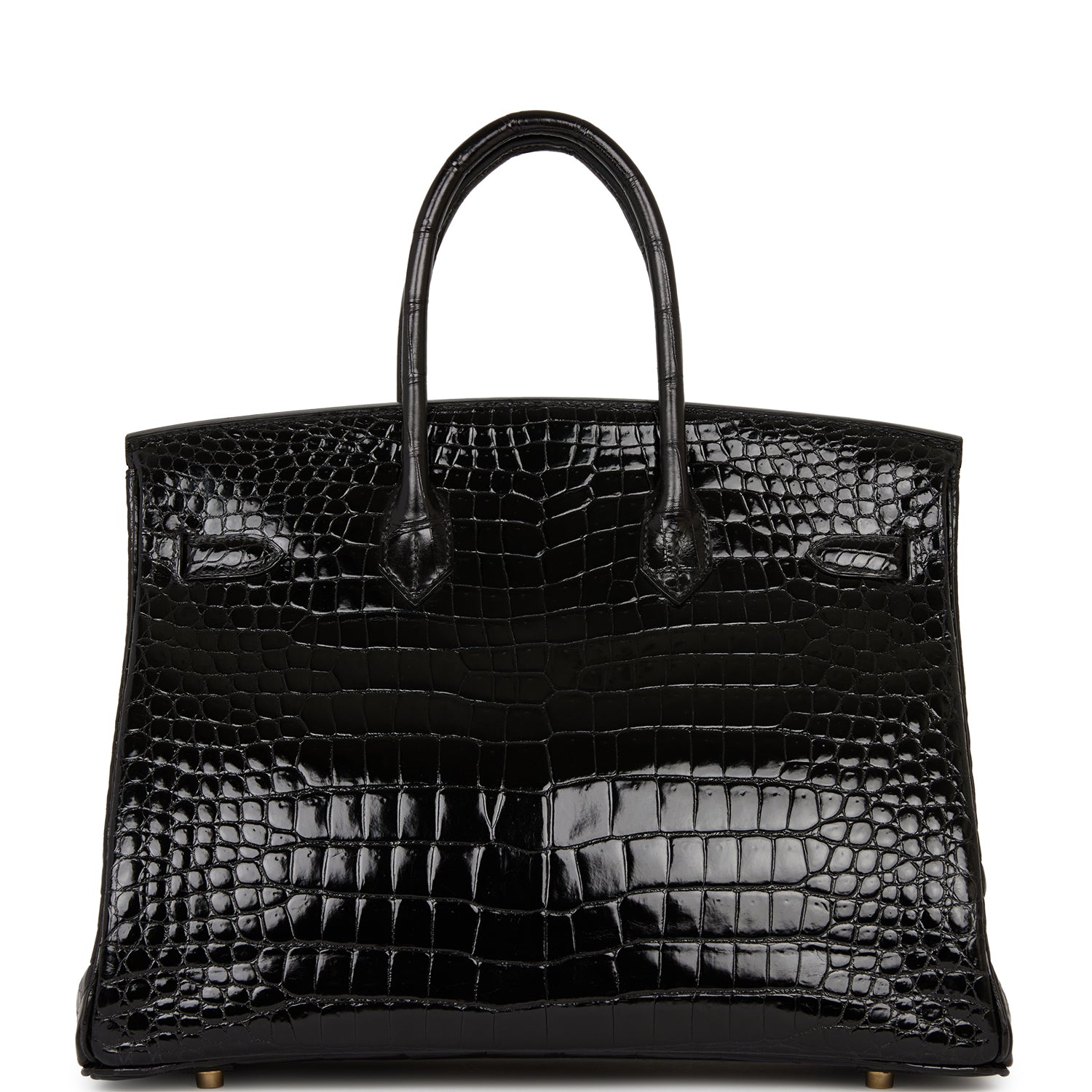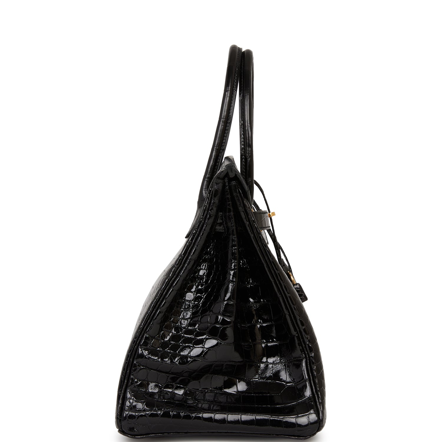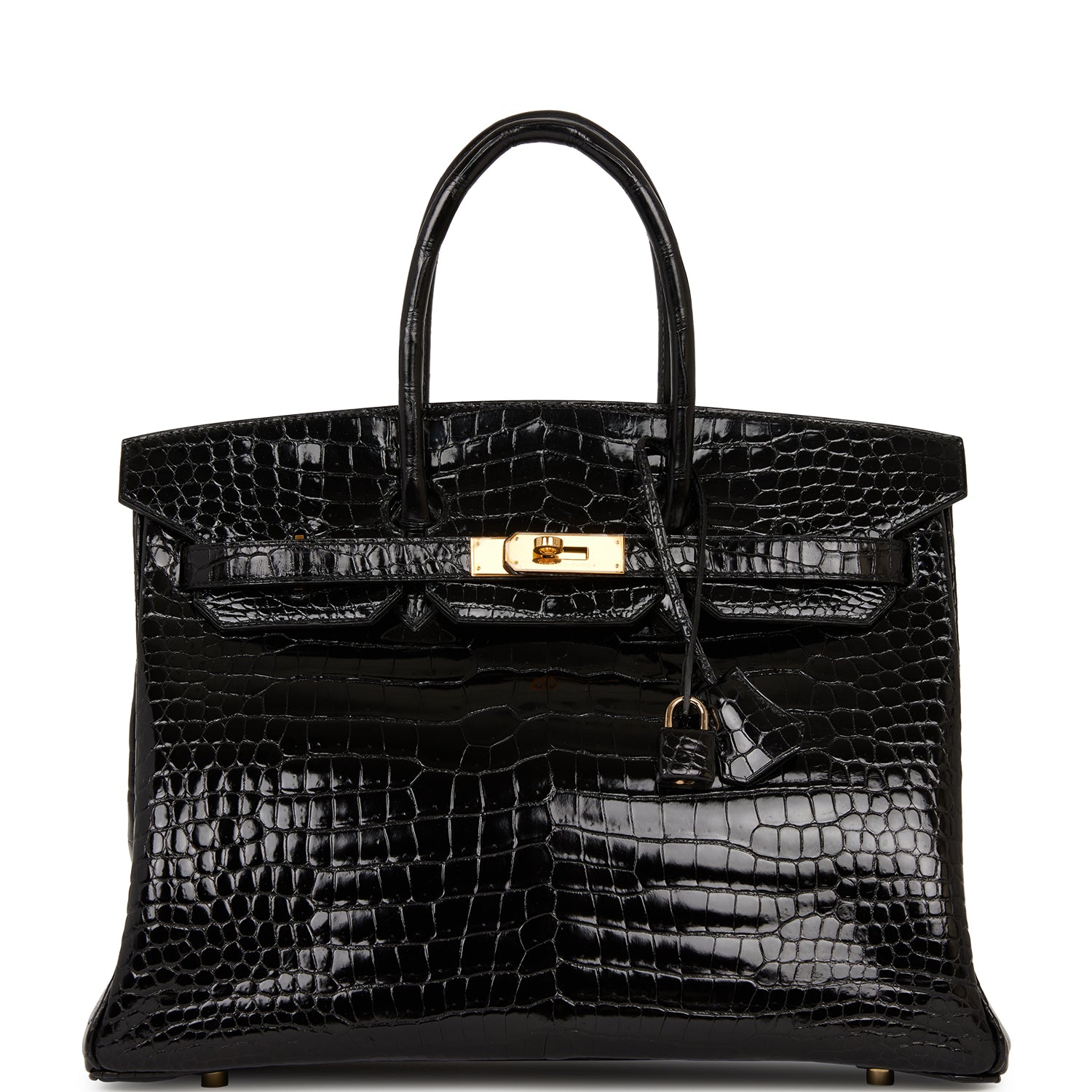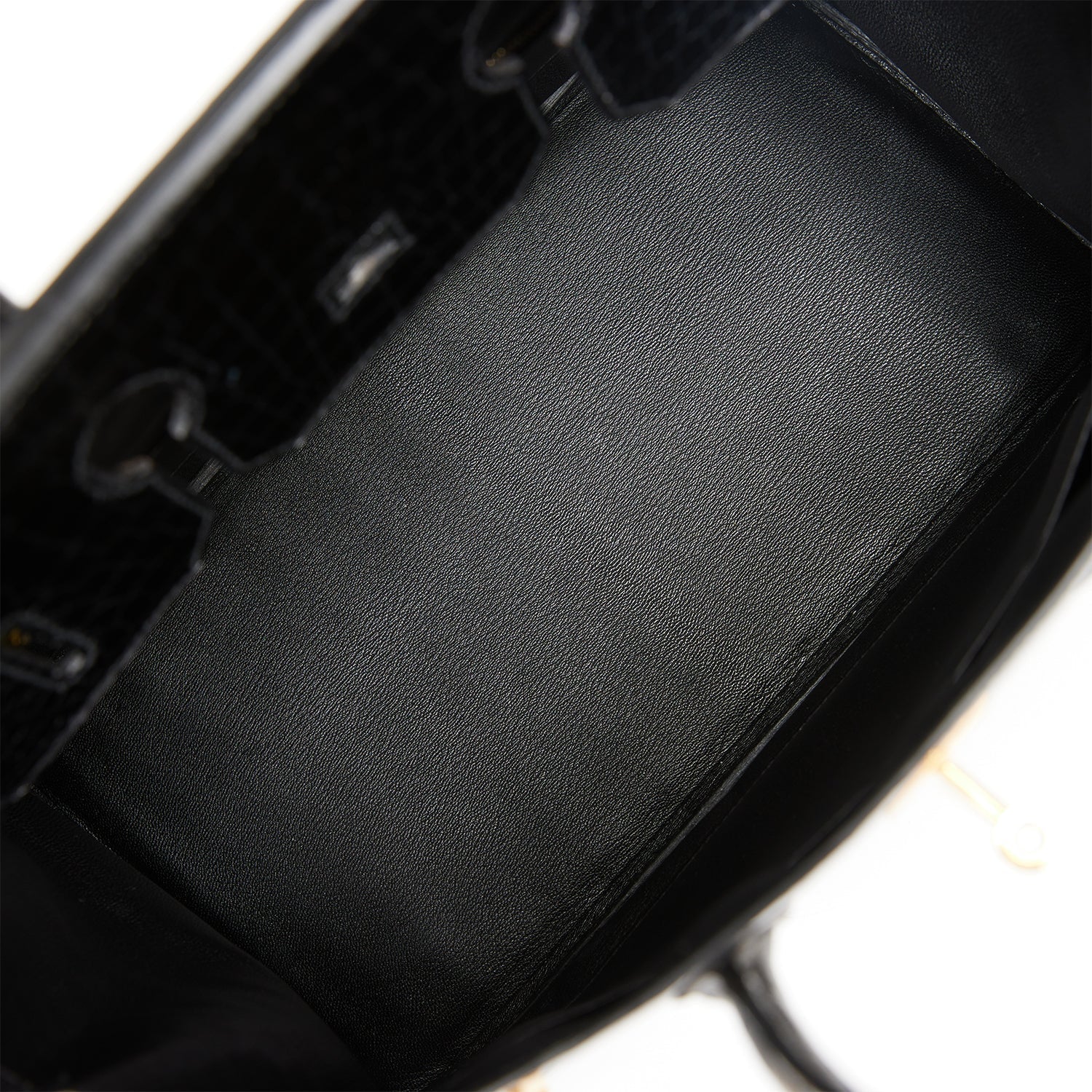 This Birkin is of black shiny Porosus crocodile with gold hardware and features tonal stitching, front flap, two straps with center toggle closure, clochette with lock and two keys, and double rolled handles.