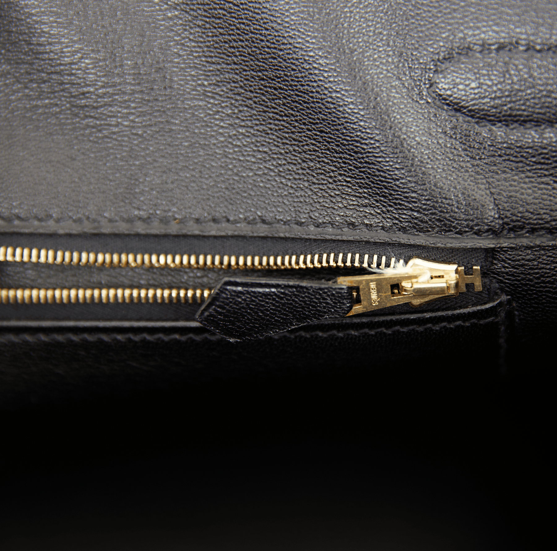 The interior is lined with black chevre and has one zip pocket with an Hermes engraved zipper pull and an open pocket on the opposite side.
