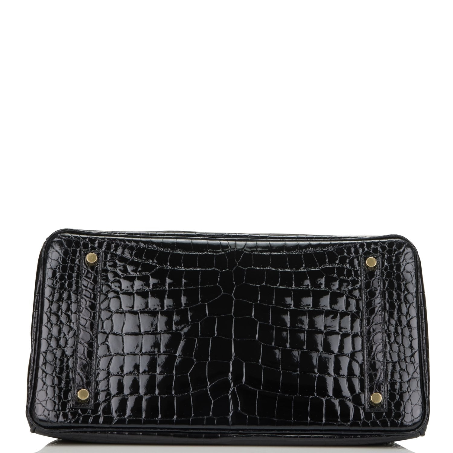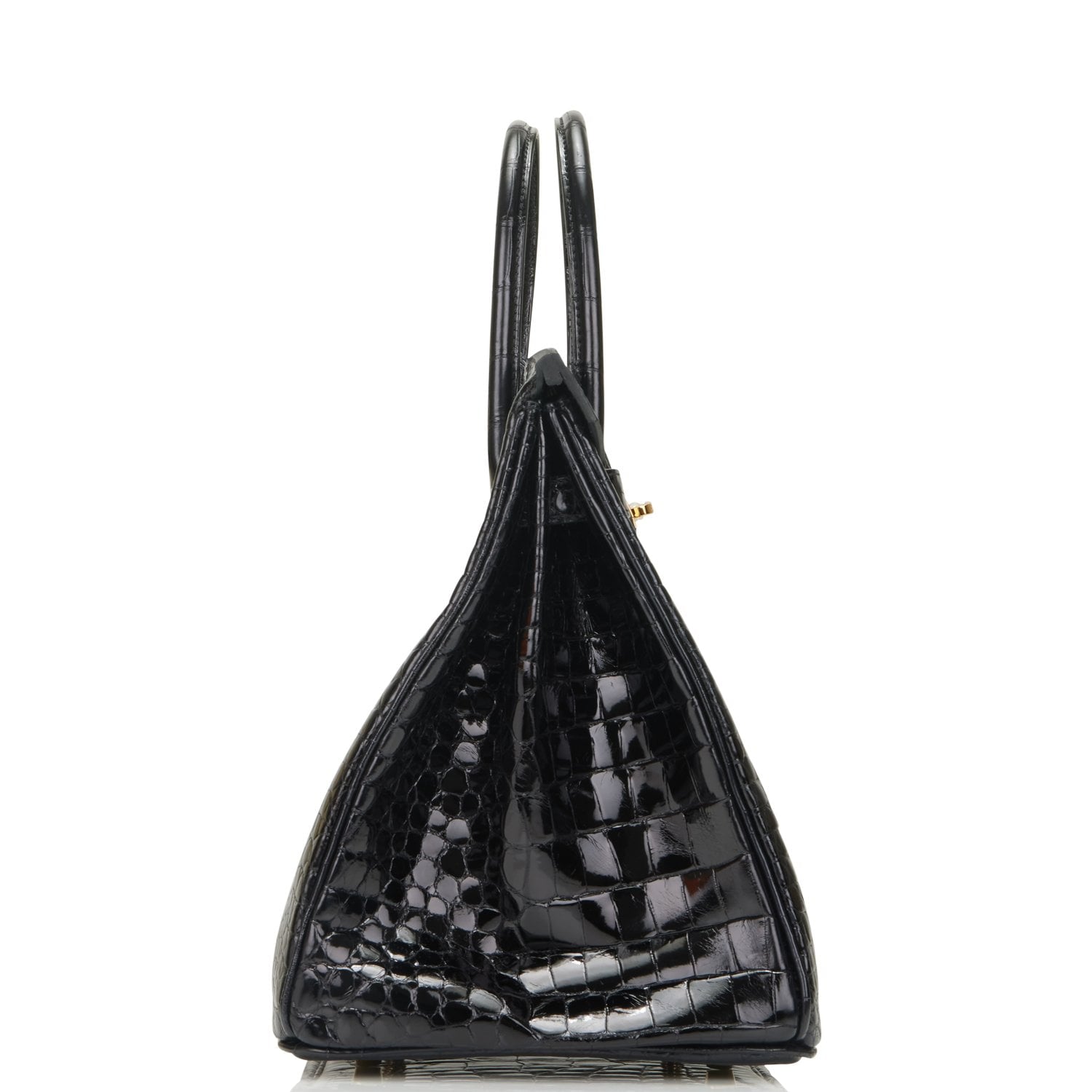 This Birkin is of black shiny Porosus crocodile with gold hardware and features tonal stitching, front flap, two straps with center toggle closure, clochette with lock and two keys, and double rolled handles.