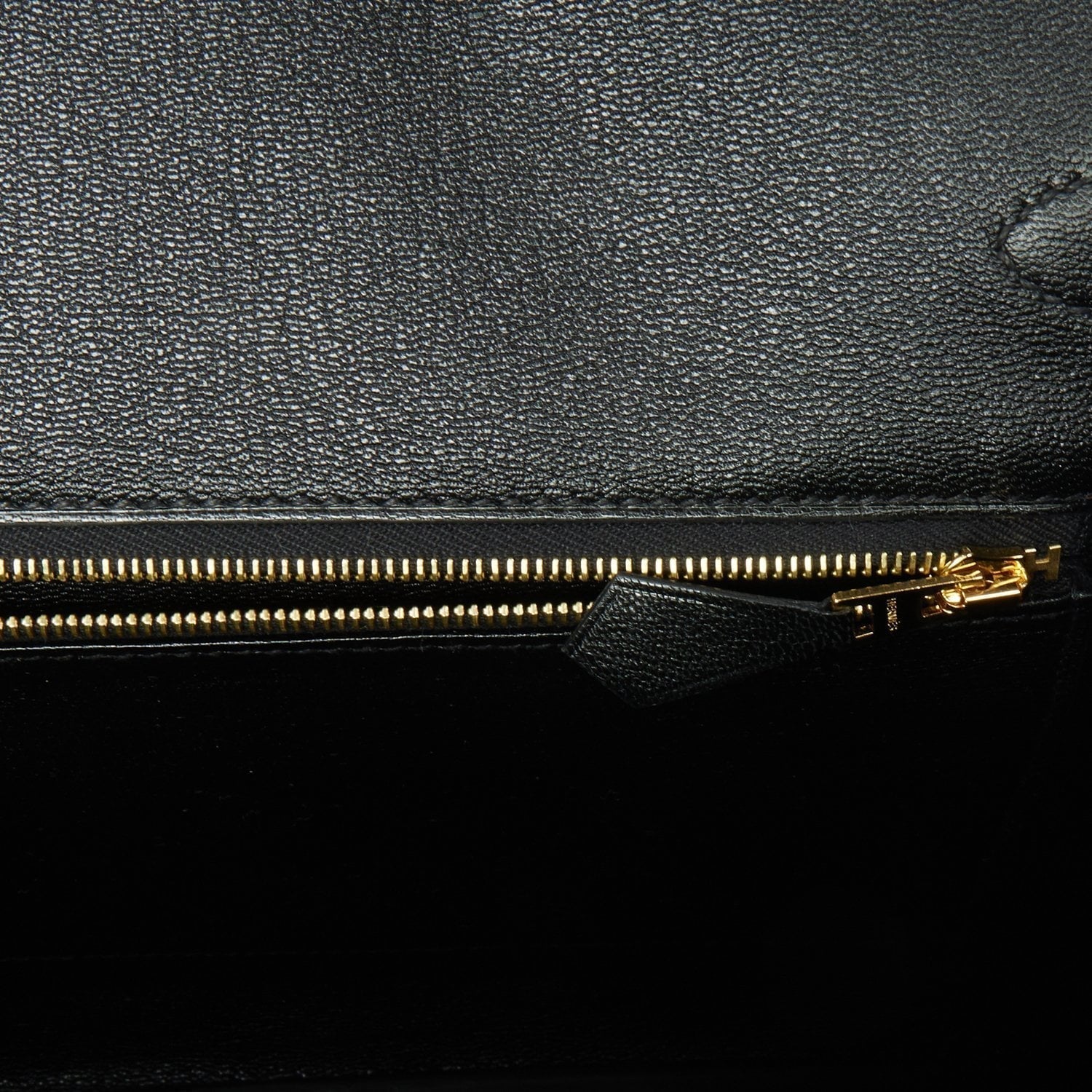 The interior is lined with black chevre and has one zip pocket with an Hermes engraved zipper pull and an open pocket on the opposite side.
