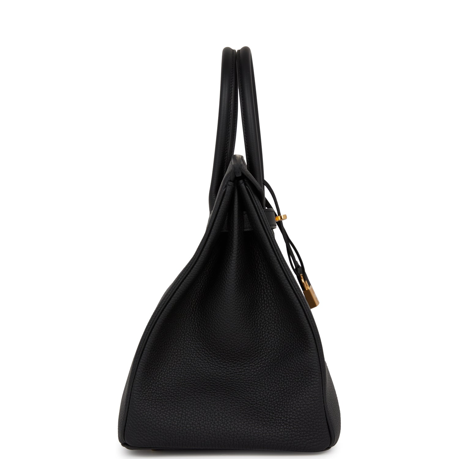 This Birkin is in Black togo leather with gold hardware and has tonal stitching, front flap, two straps with center toggle closure, clochette with lock and two keys, and double rolled handles.