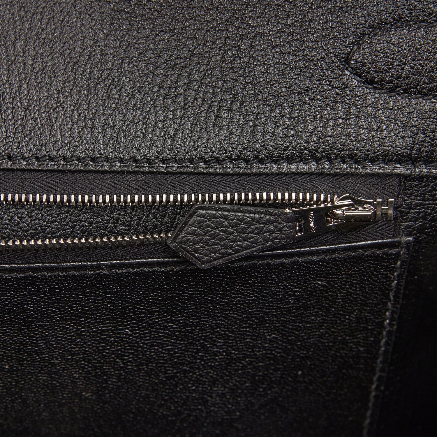 The interior is lined with black chevre and has one zip pocket with an Hermes engraved zipper pull and an open pocket on the opposite side.