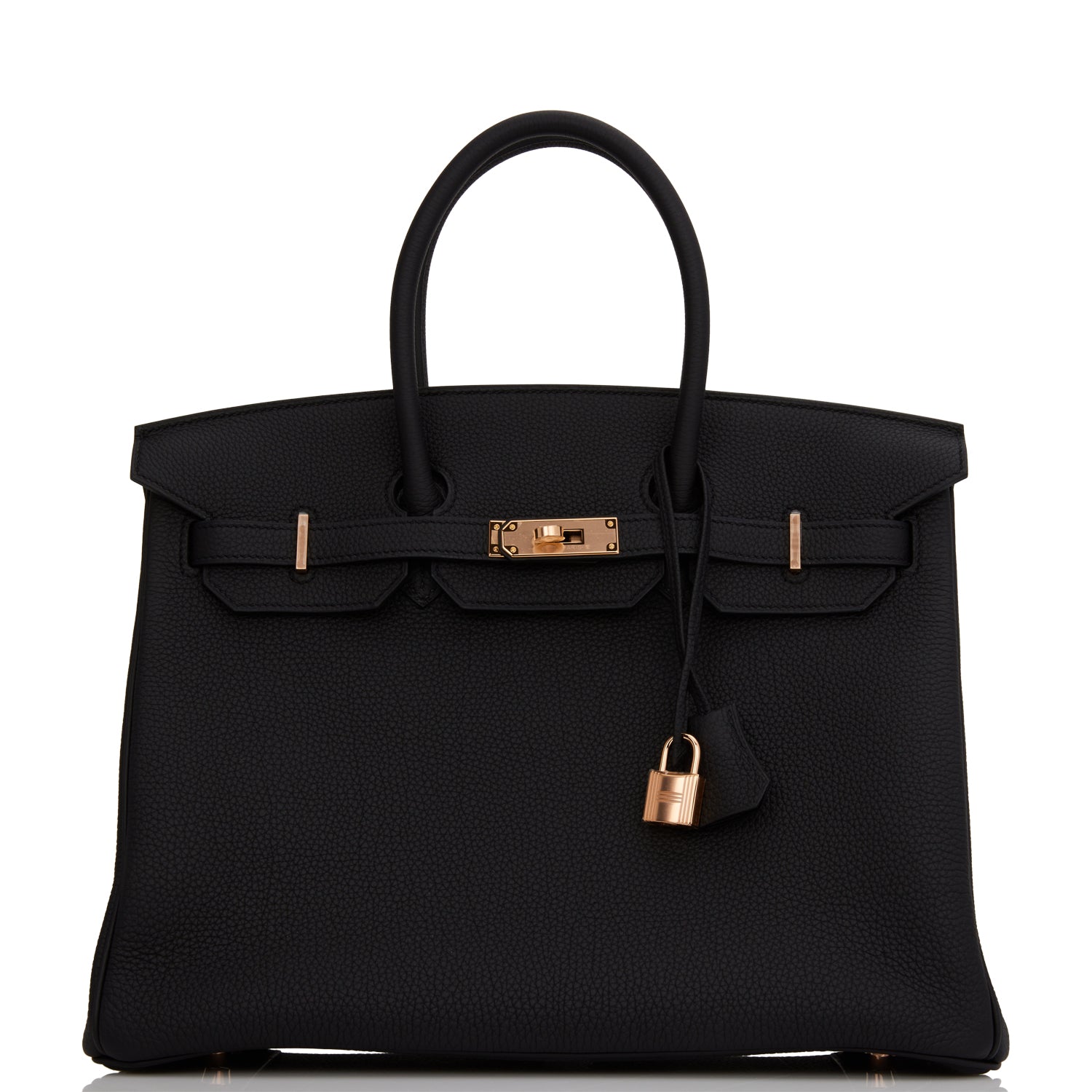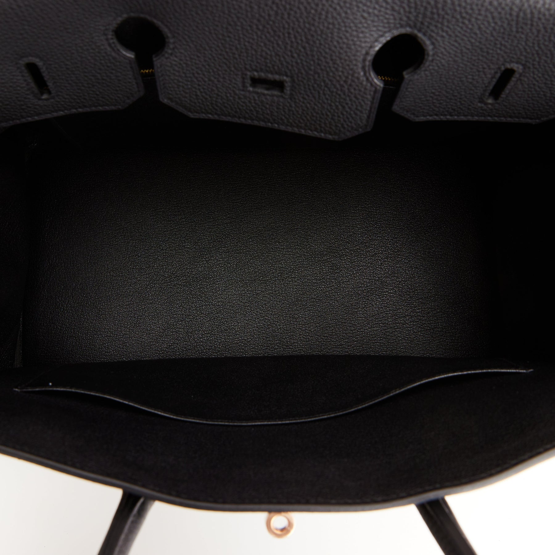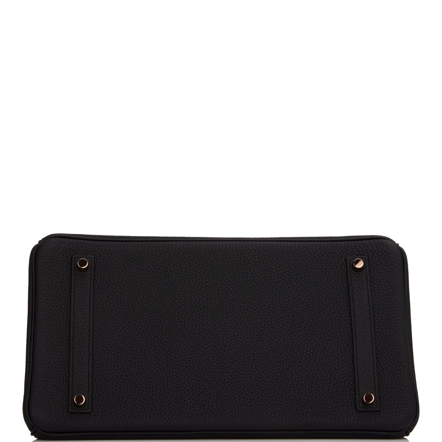 This Birkin is in Black togo leather with rose gold hardware and has tonal stitching, front flap, two straps with center toggle closure, clochette with lock and two keys, and double rolled handles.