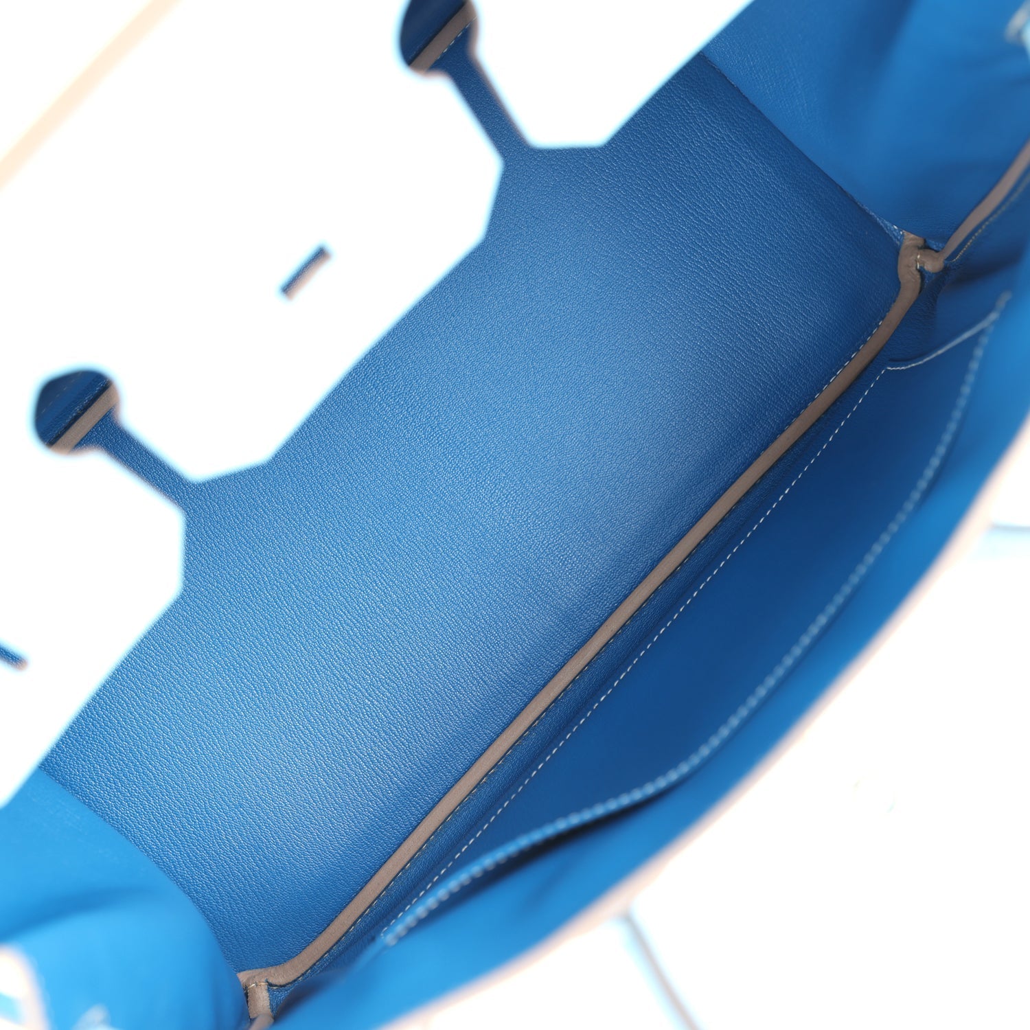 The interior is lined with Bleu Mykonos chevre and has one zip pocket with an Hermes engraved zipper pull and an open pocket on the opposite side.