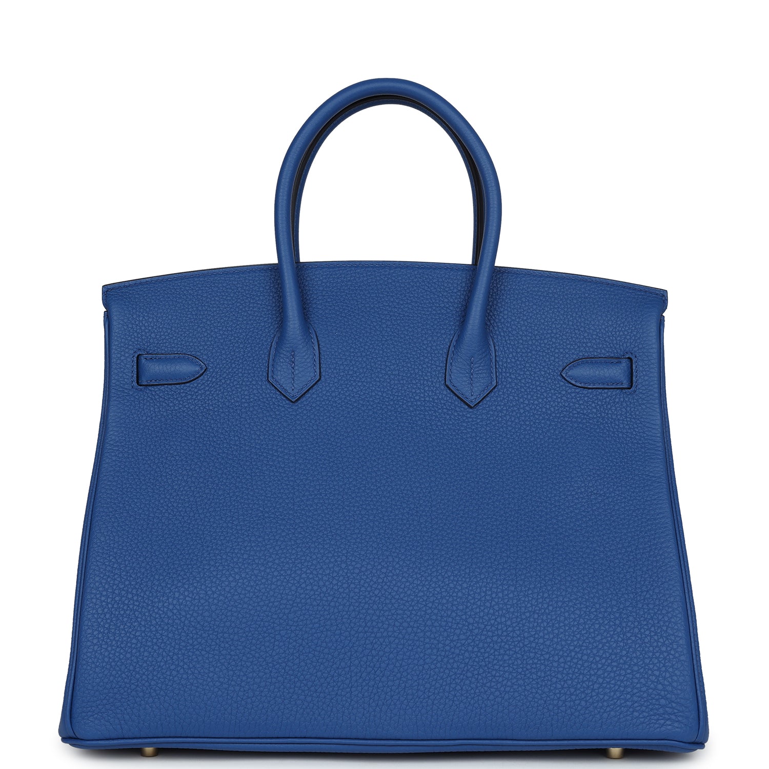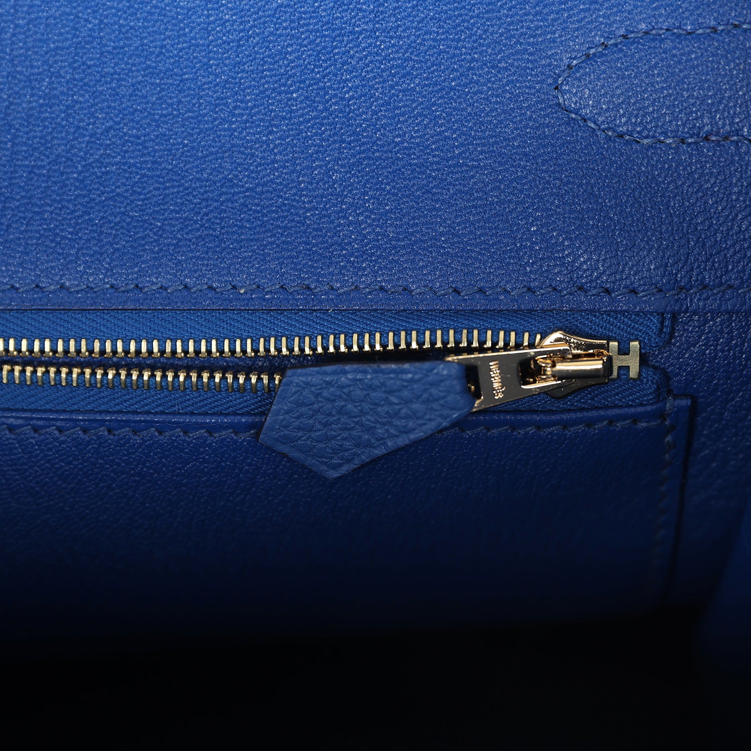 Birkin is in Bleu Royal togo leather with gold hardware and has tonal stitching, two straps with front toggle closure, clochette with lock and two keys and double rolled handles.
