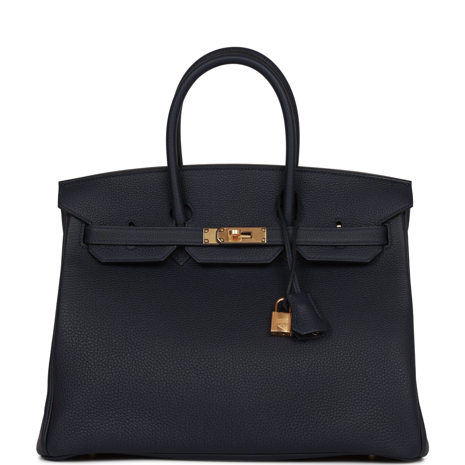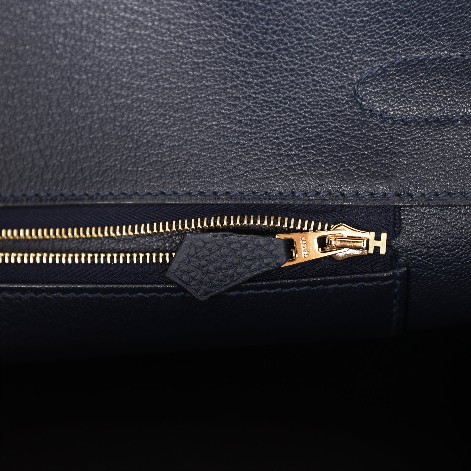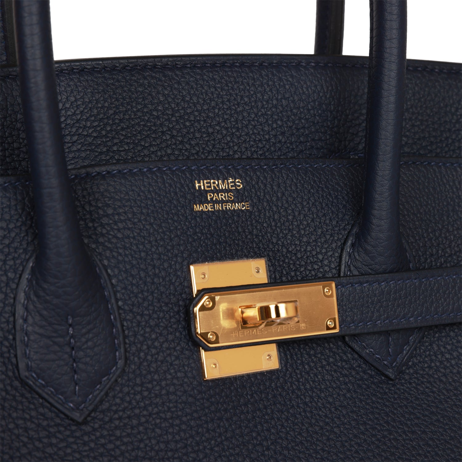 This Birkin is in Bleu Nuit togo leather with gold hardware and has tonal stitching, front flap, two straps with center toggle closure, clochette with lock and two keys, and double rolled handles.