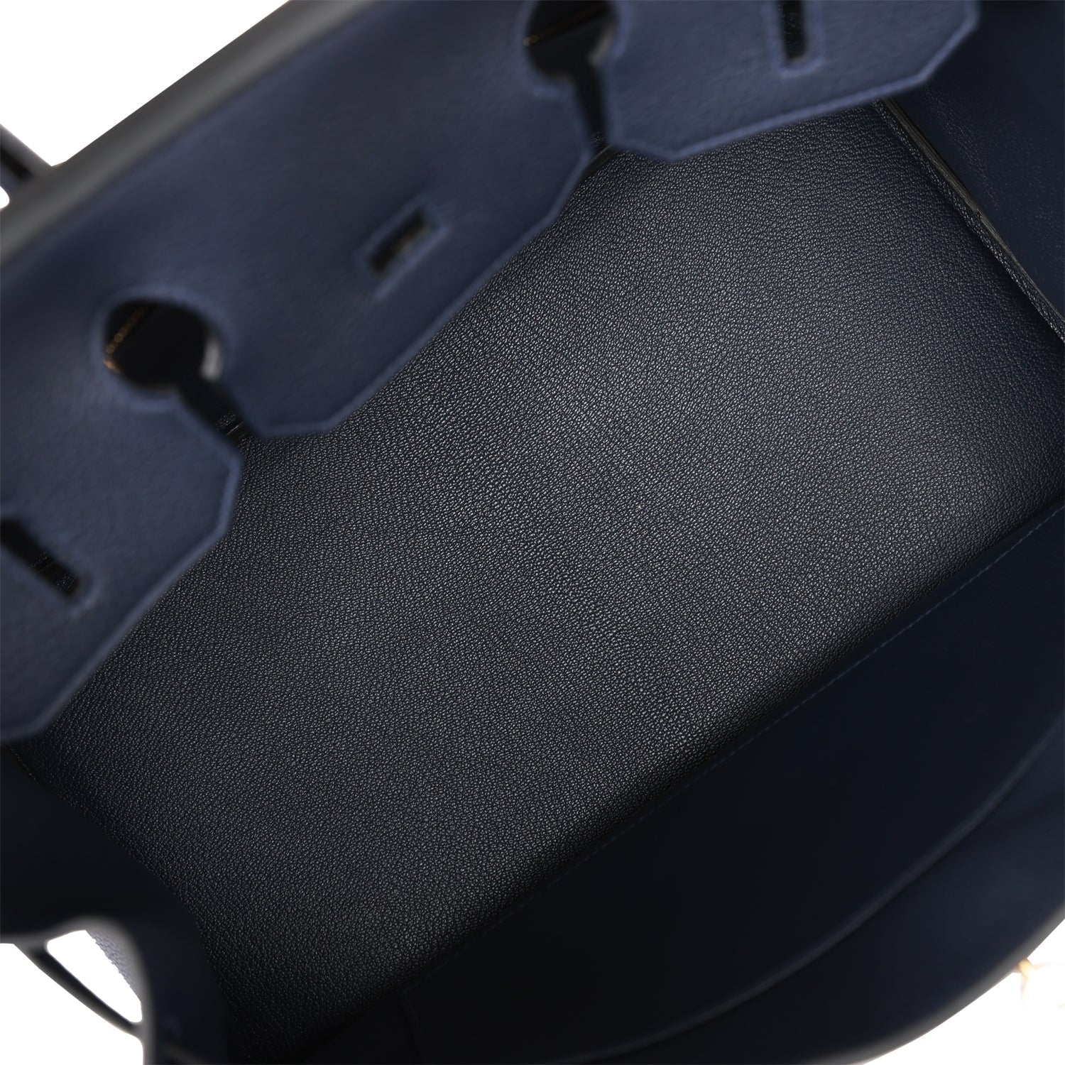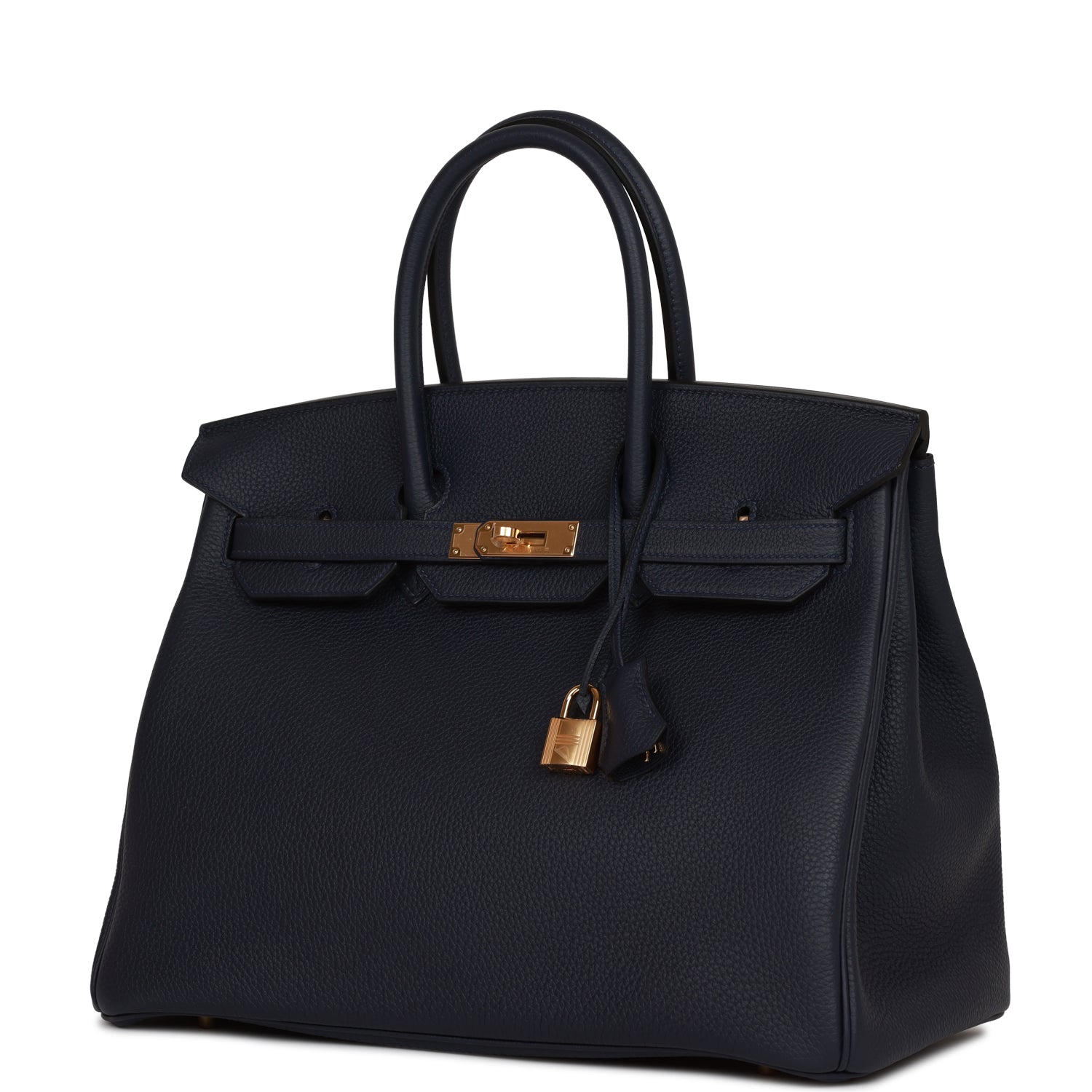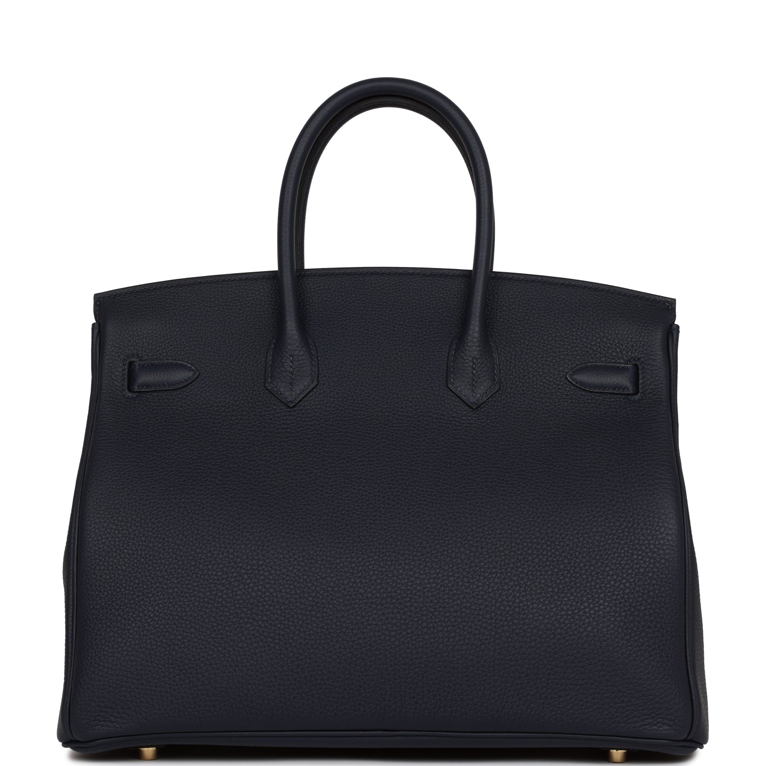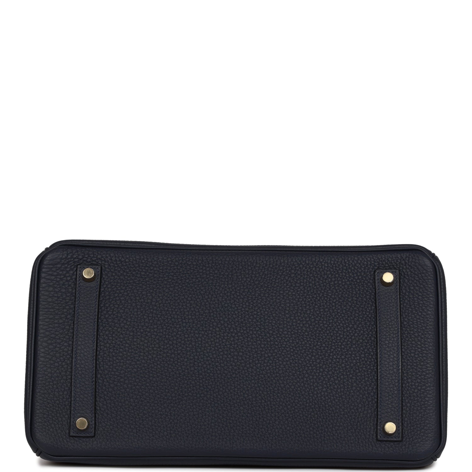 This Birkin is in Bleu Nuit togo leather with gold hardware and has tonal stitching, front flap, two straps with center toggle closure, clochette with lock and two keys, and double rolled handles.