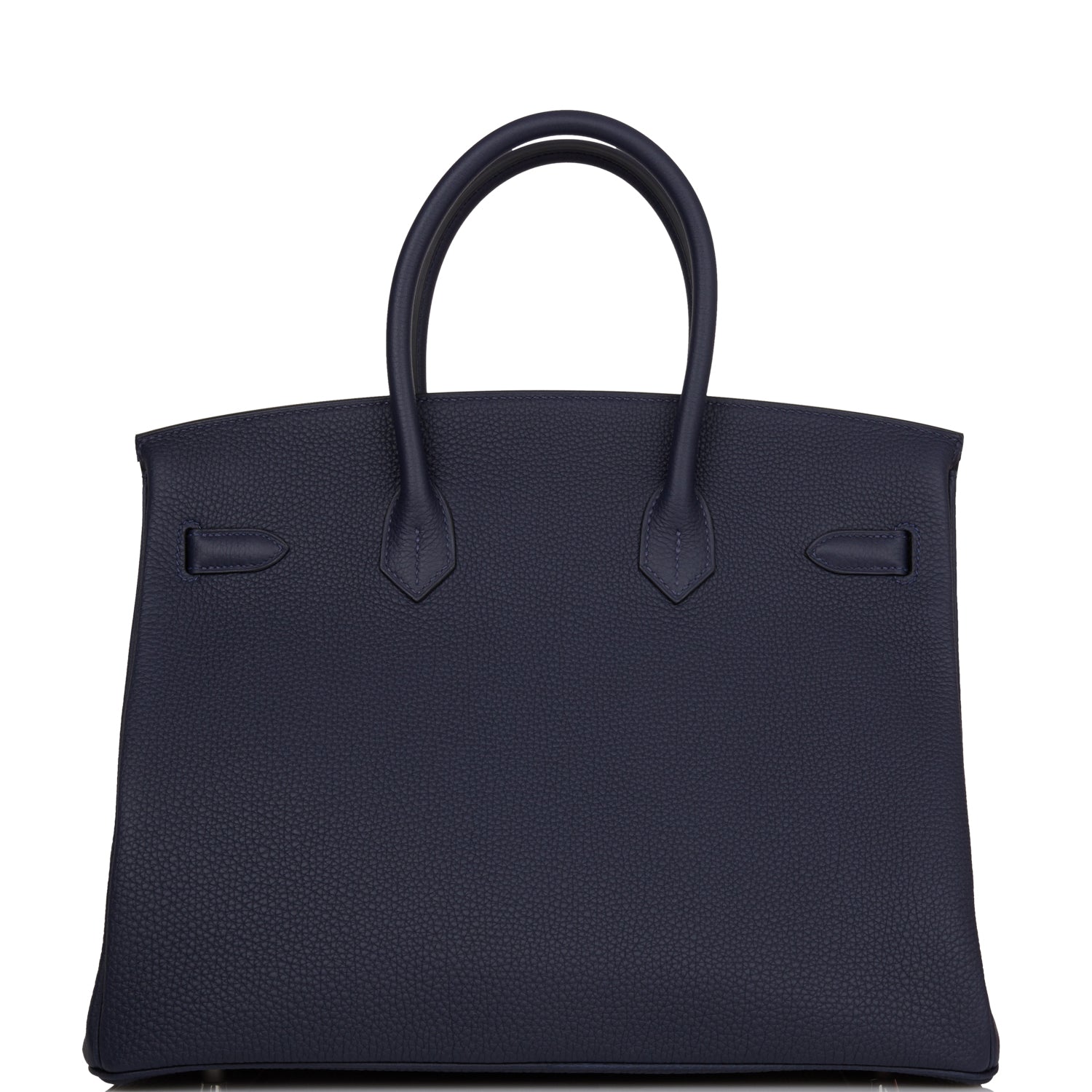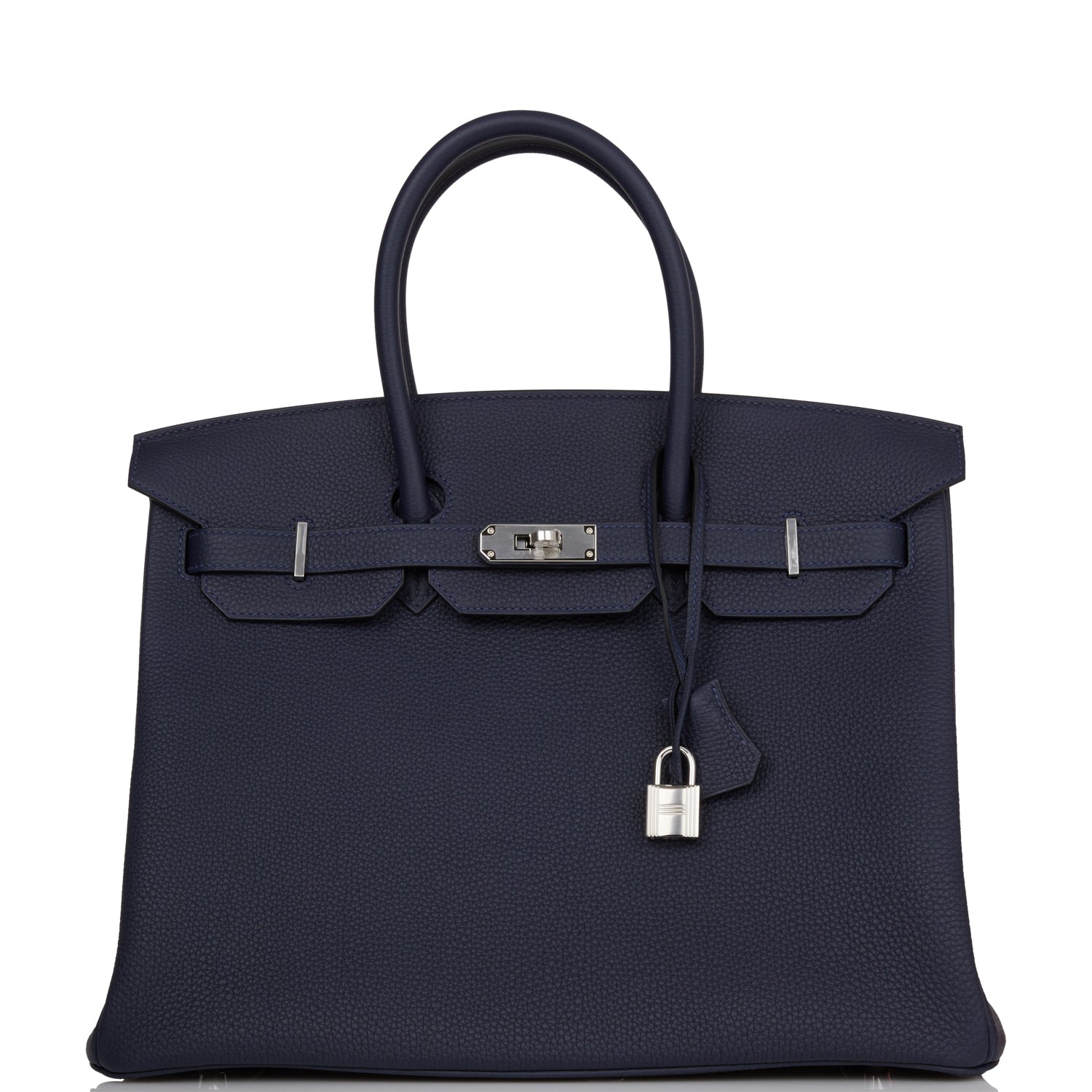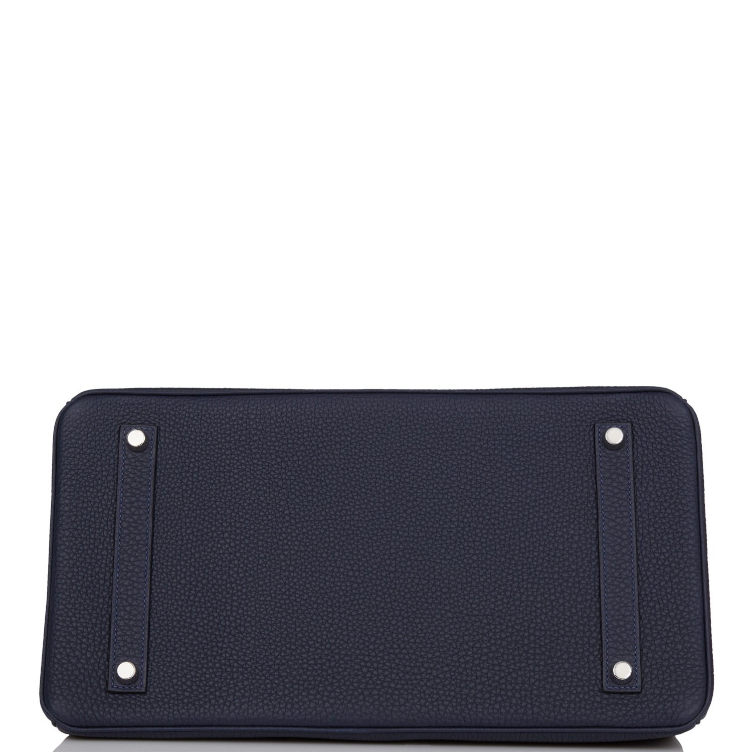 This Birkin is in Bleu Nuit togo leather with palladium hardware and has tonal stitching, front flap, two straps with center toggle closure, clochette with lock and two keys, and double rolled handles.