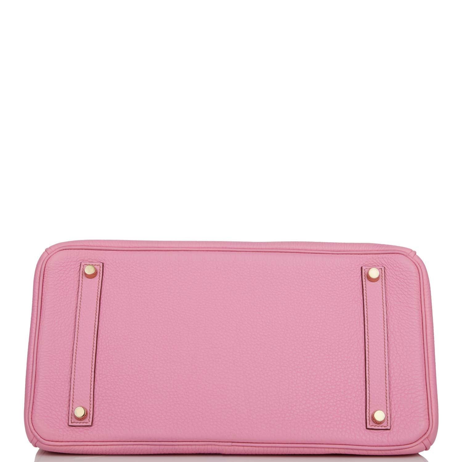 This super collectible Birkin is in Bubblegum togo leather with gold hardware and has contrast stitching, a front toggle closure, a clochette with lock and two keys, and double rolled handles.