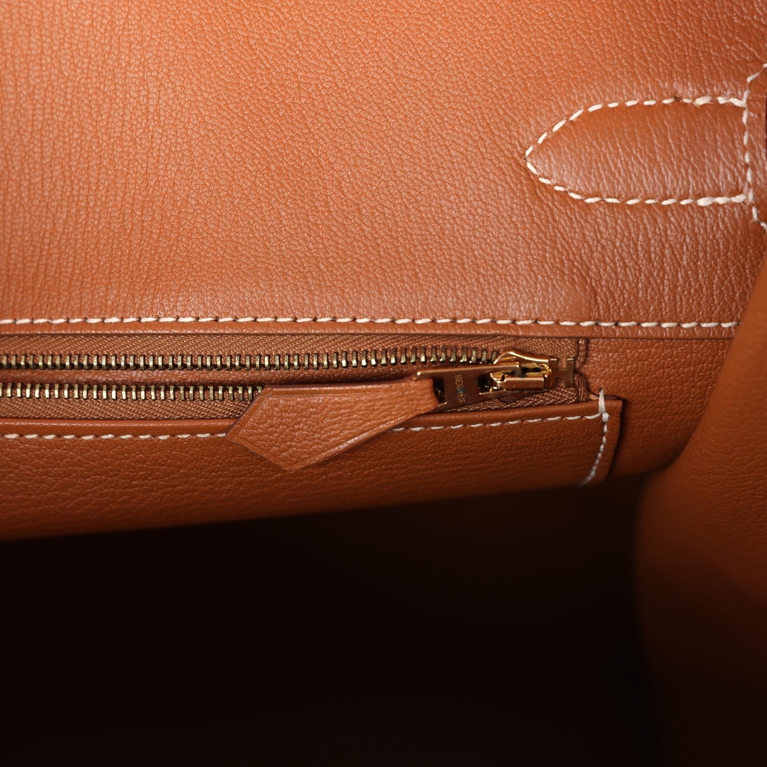 The interior is lined in Gold chevre with one zip pocket with an Hermes engraved zipper pull and an open pocket on the opposite side.