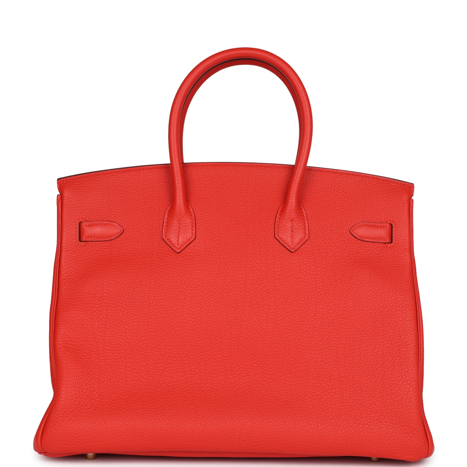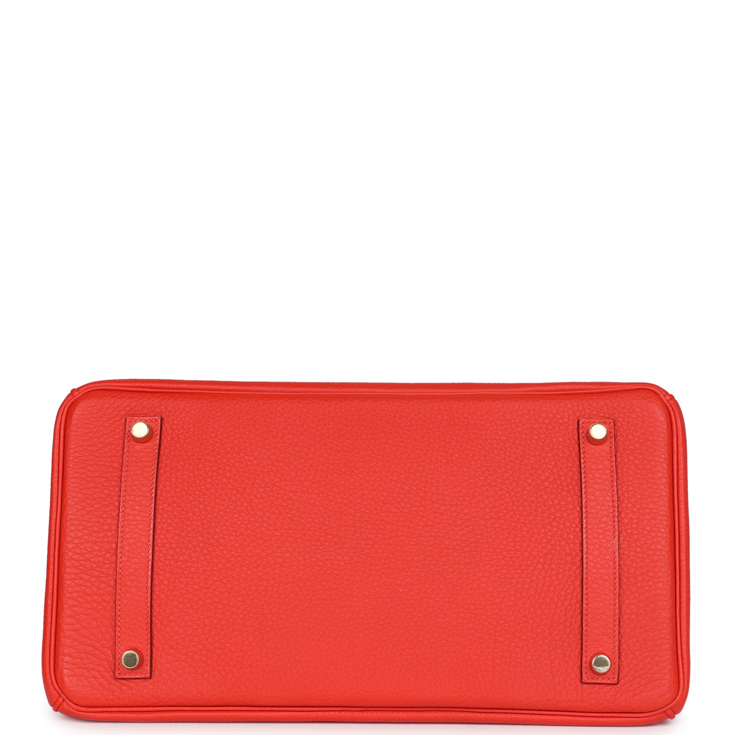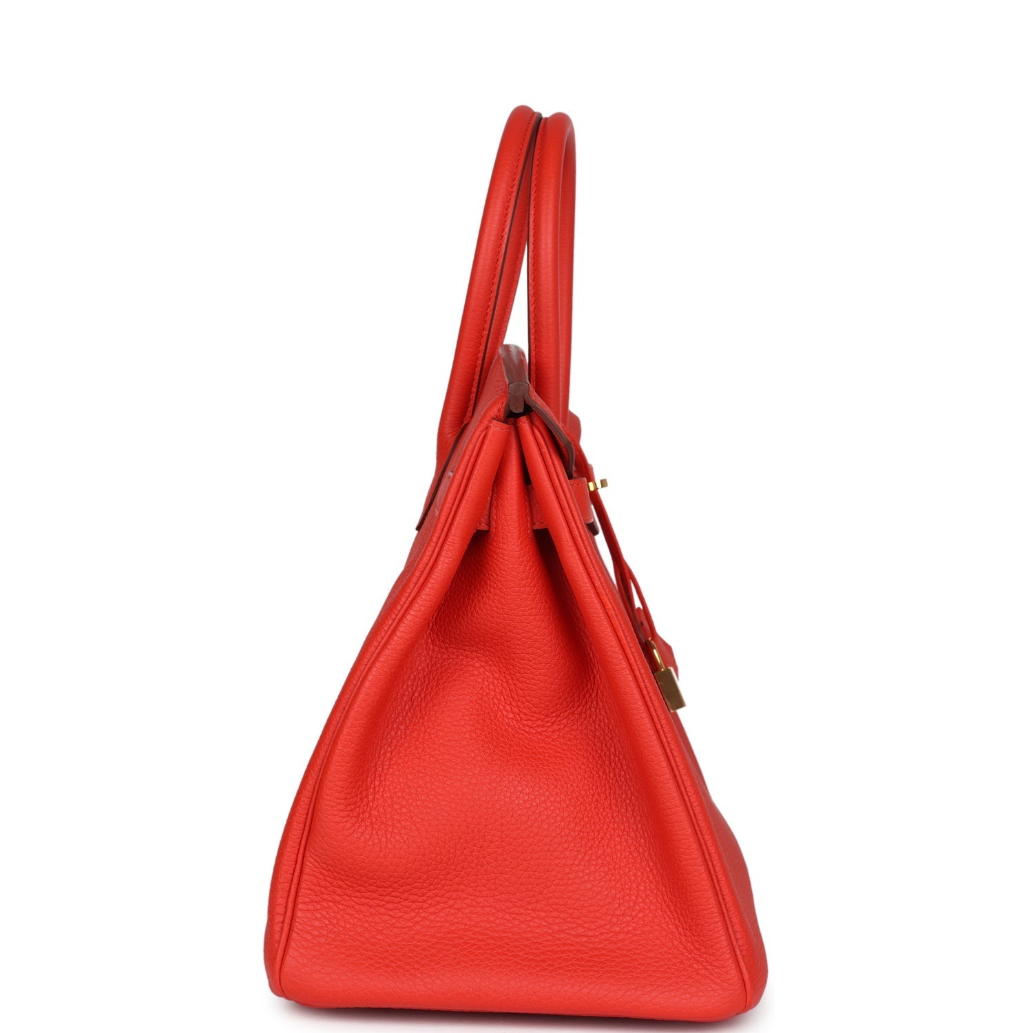 Birkin is in Capucine togo leather with gold hardware and has tonal stitching, front flap, two straps with center toggle closure, clochette with lock and two keys, and double rolled handles.