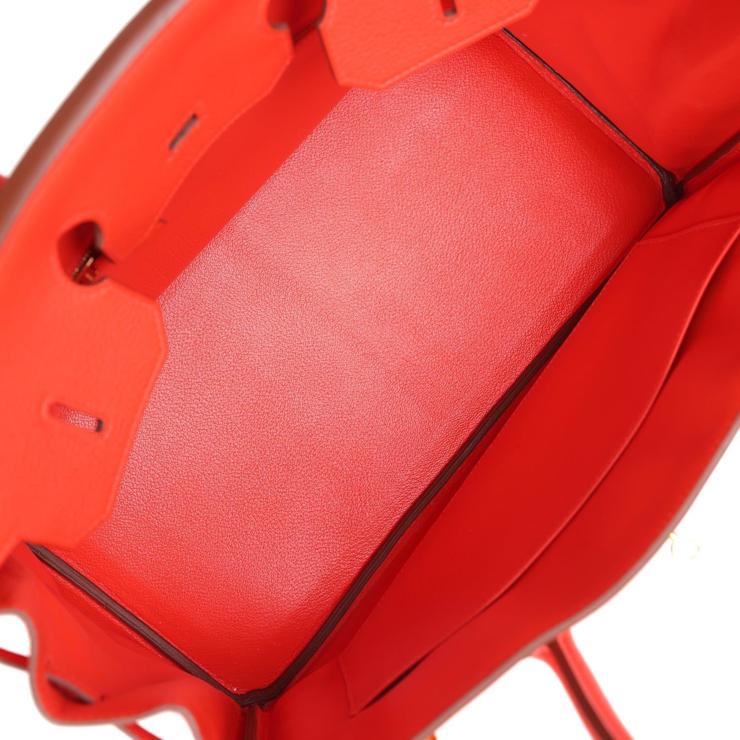 The interior is lined with Capucine chevre and has one zip pocket with an Hermes engraved zipper pull and an open pocket on the opposite side.